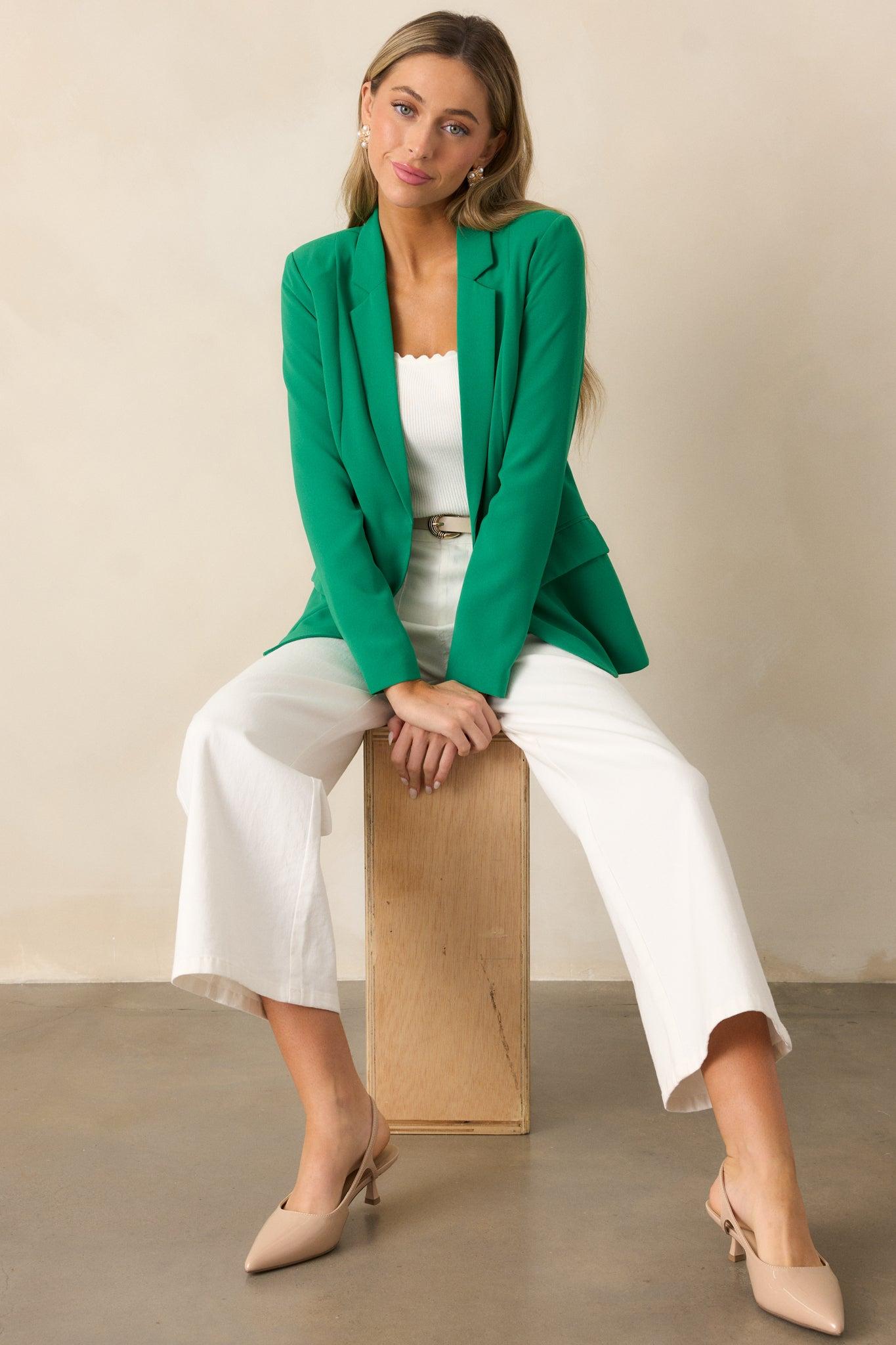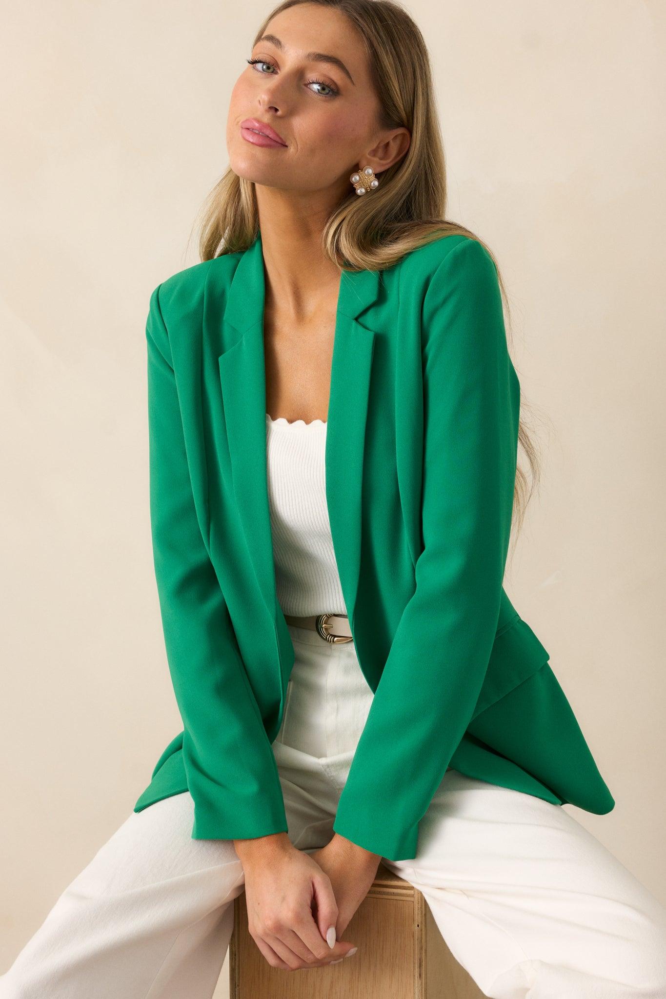 Introducing the Grace In Every Step Lightweight Kelly Green Blazer - the perfect combination of style and comfort! With a sleek green color and lightweight material, you'll feel effortlessly chic while also staying cool and comfortable. Perfect for the office to a night out, this blazer is sure to become your new go-to piece in your wardrobe. This green blazer features a notched lapel collared neckline, shoulder padding, no button closure, functional pockets, a floral lining, and long sleeves.