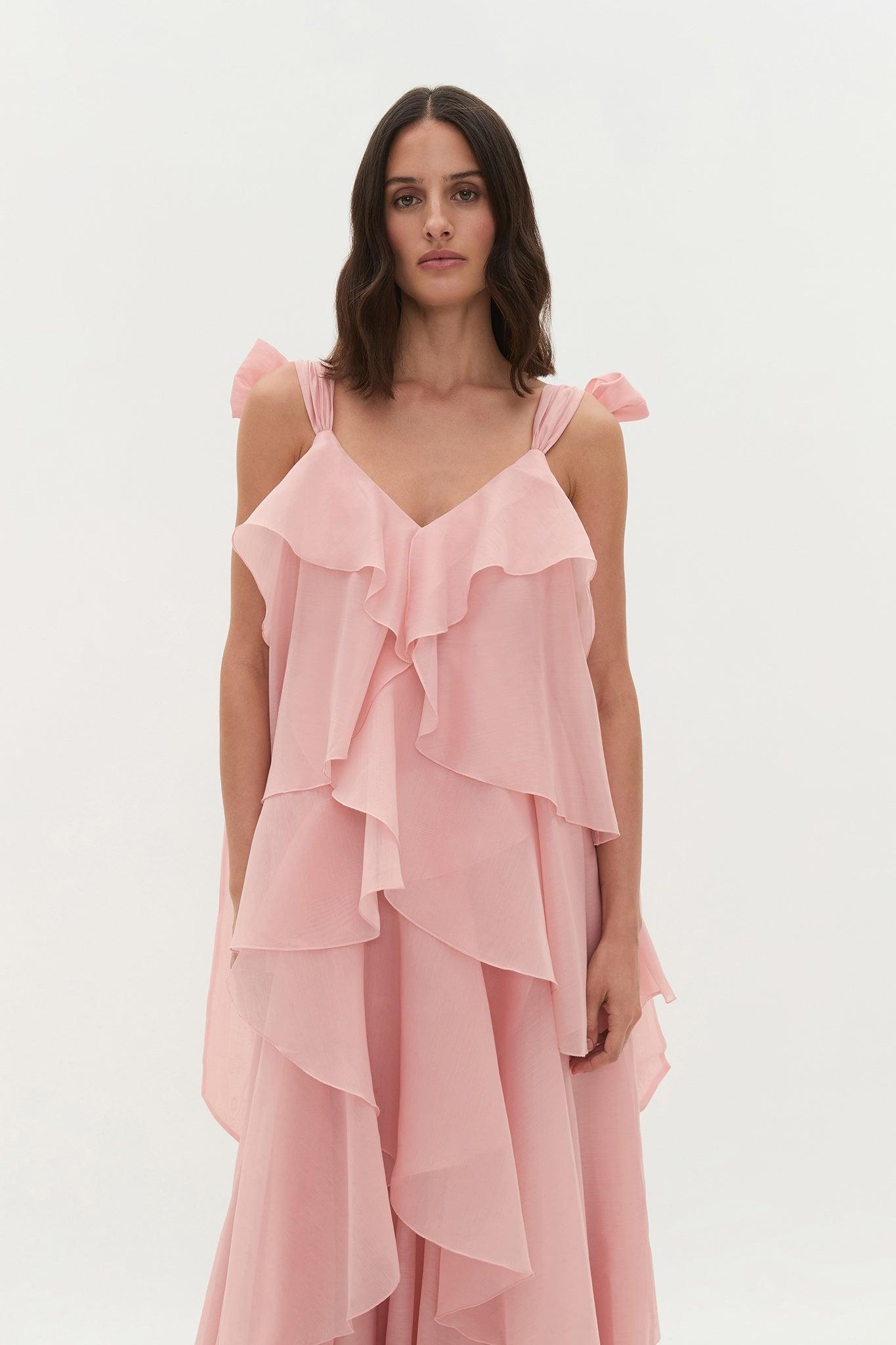 PRODUCT DETAILS As Seen On Madison Woolley at the Resort 26 Runway Show Arriving in August 2025 Women’s maxi dress V-neckline Tie back straps with bows Asymmetric tier detail throughout Detachable Rouleau belt Zip, hook and eye closure Lined style 100% Polyester Shop All Dresses SIZE AND FIT Model wears a size AU 8/S Height: 178cm/ 5’10 Bust: 84cm Waist: 64cm Hips: 86cm