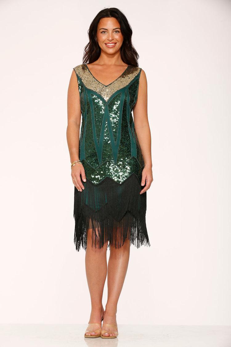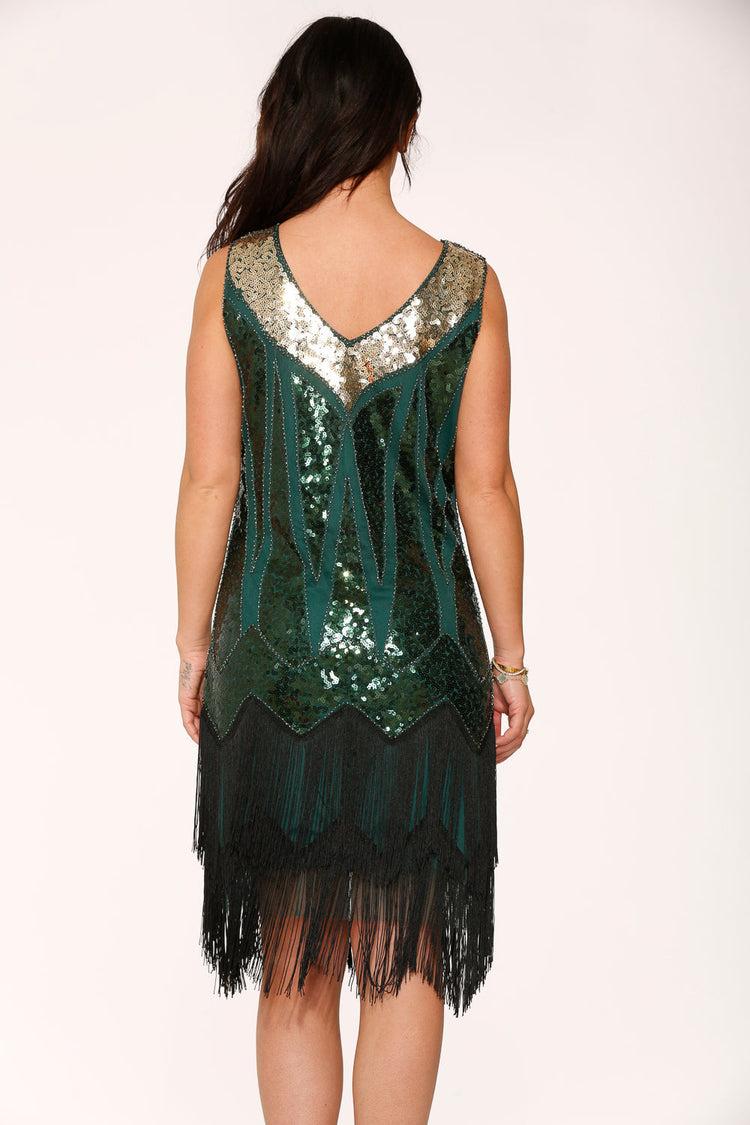 Light up the dance floor in this radiant emerald green flapper dress by Orchid Bloom. Featuring shimmering sequins, a gold-accented neckline, and layered fringe for playful movement, this vintage-inspired piece brings Gatsby glam to any celebration.97% Polyester, 3% SpandexFabric provides comfortable stretchSide zipper closureApprox. length: 41"Imported