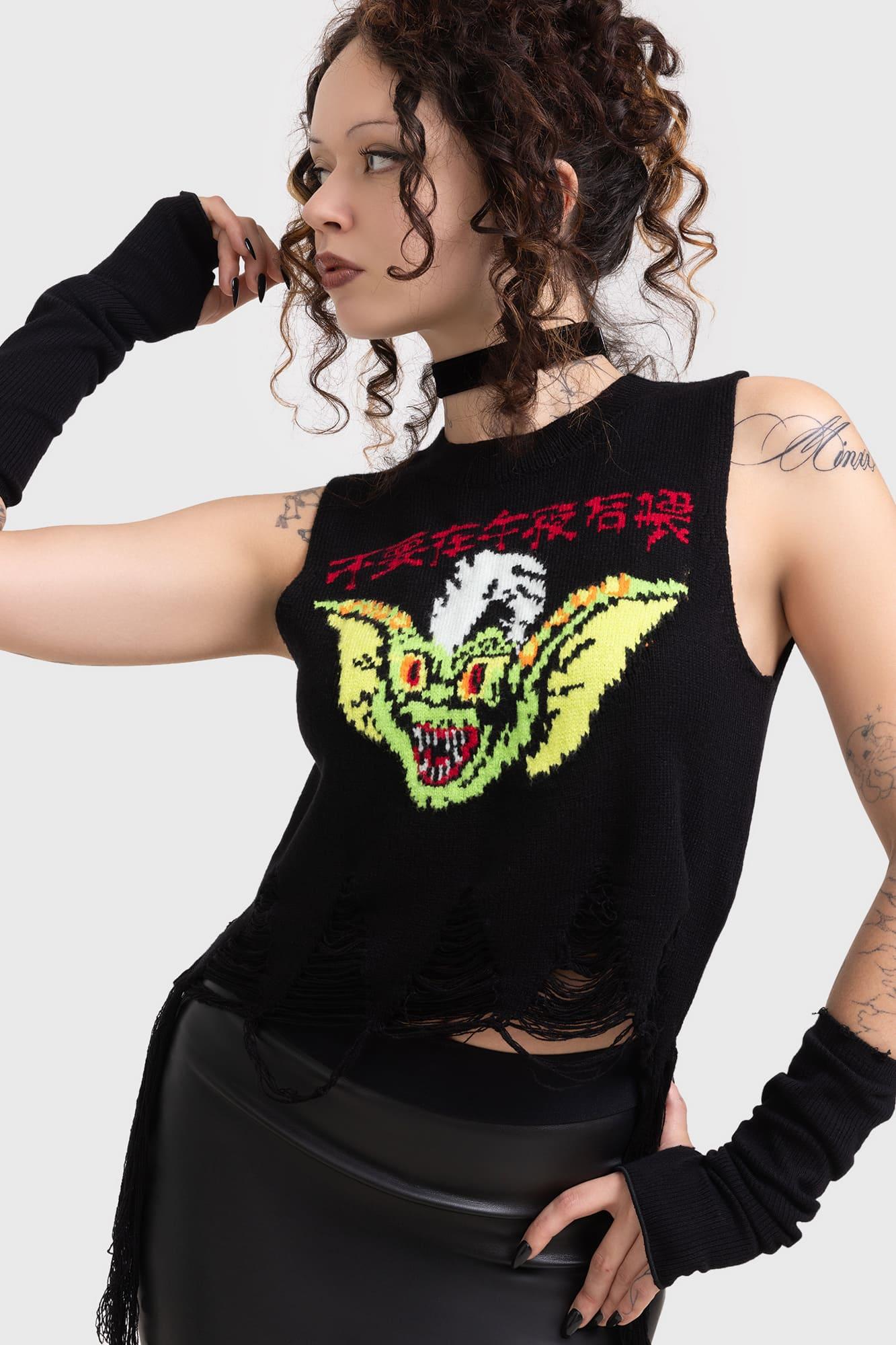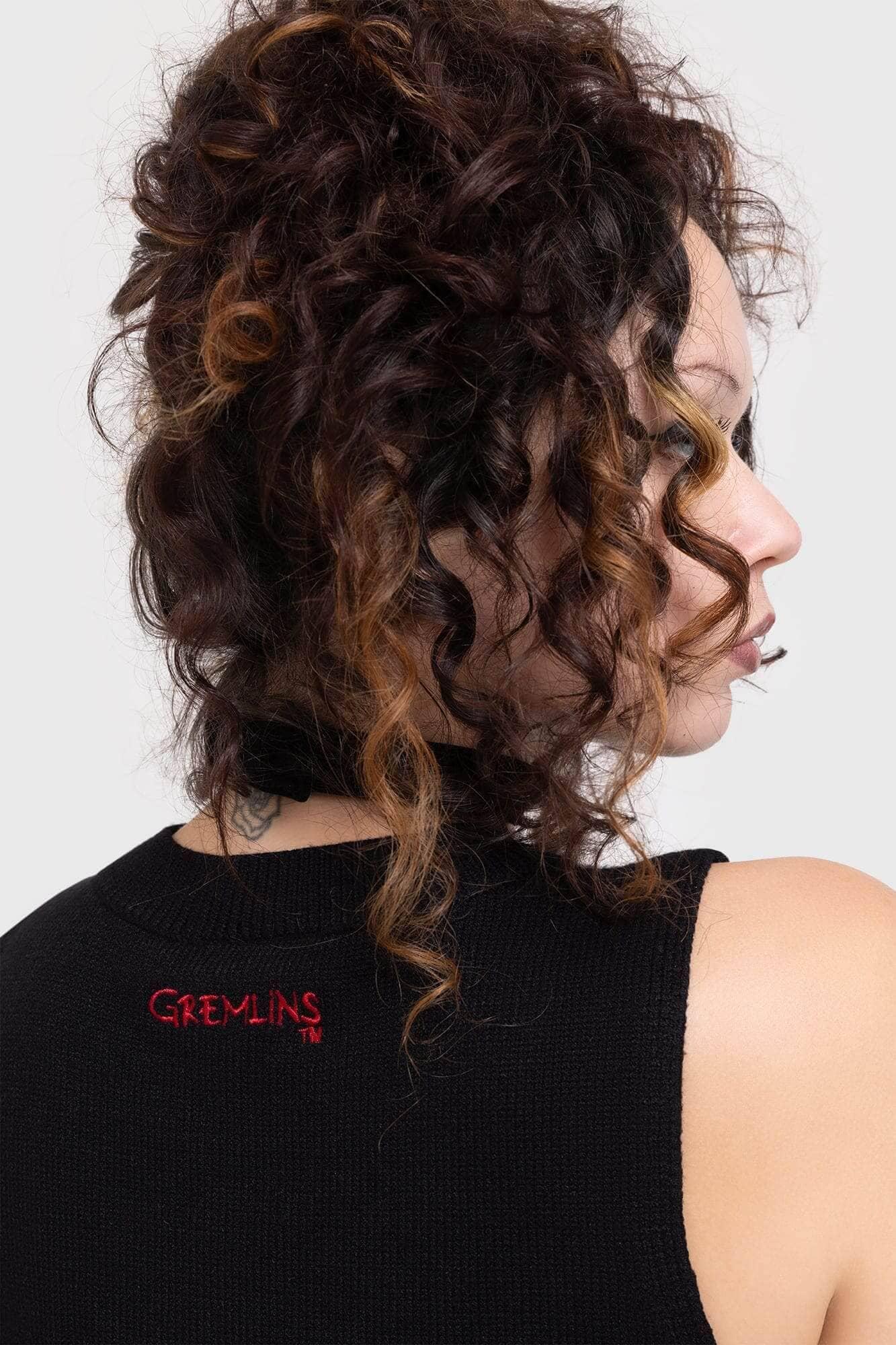 GREMLIN STRIPE.- Official licenced Gremlins product.- Soft, stretch knit.- Statement Gremlins graphic.- Slightly cropped.- Embroidered 'GREMLINS' detail.- Crew neckline.- Distressed hem.- Fitted.With KILLSTAR branding, 53% Viscose 30% Polyester 17% Polyamide.Machine wash cold (30°C) / Do not bleach / Do not tumble dry / Iron at low temperature / Do not dry clean. I mported.@ WARNER BROS. Entertainment Inc.