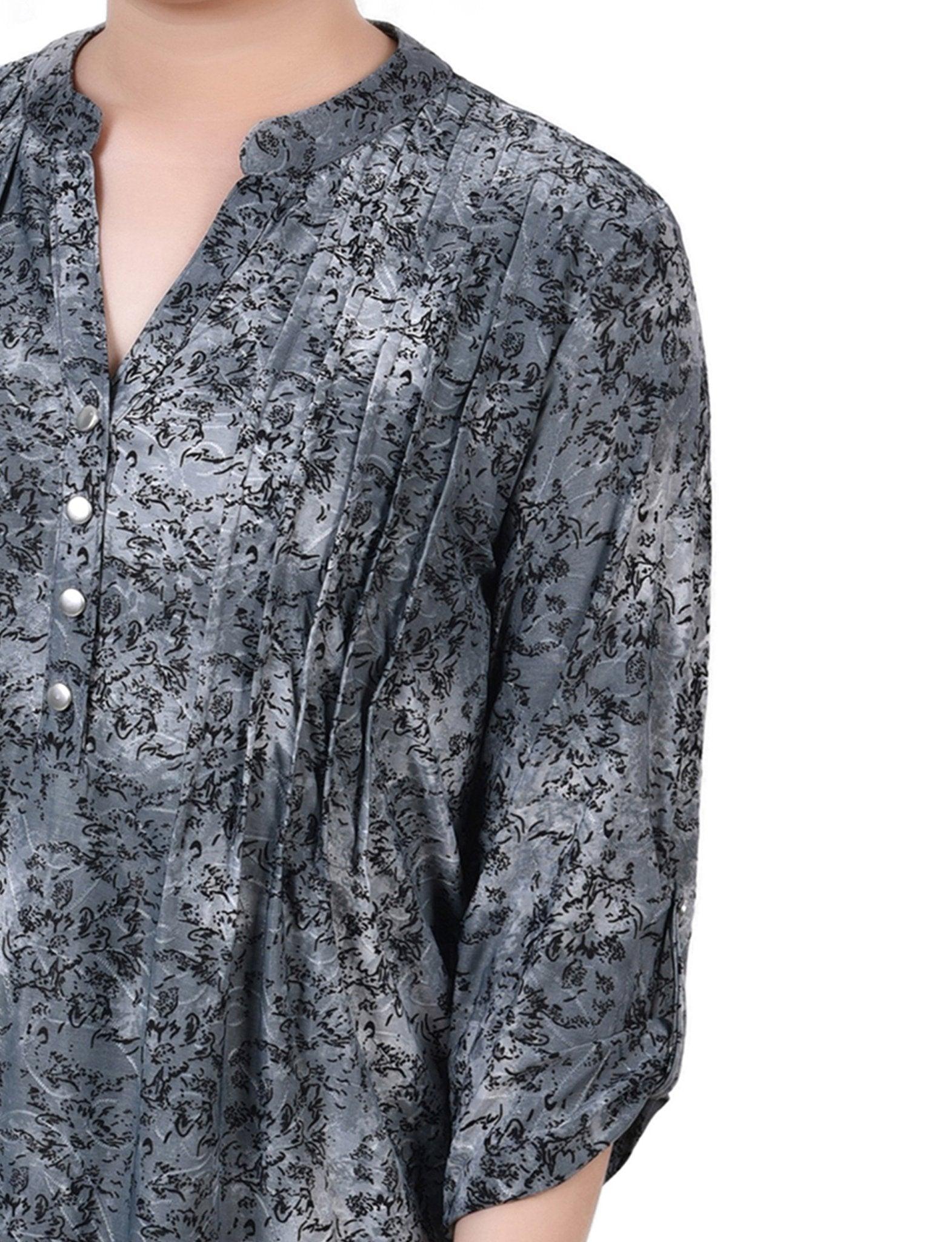 Grey Floral 3/4 Sleeve Roll Tab Y Neck Top - Petite