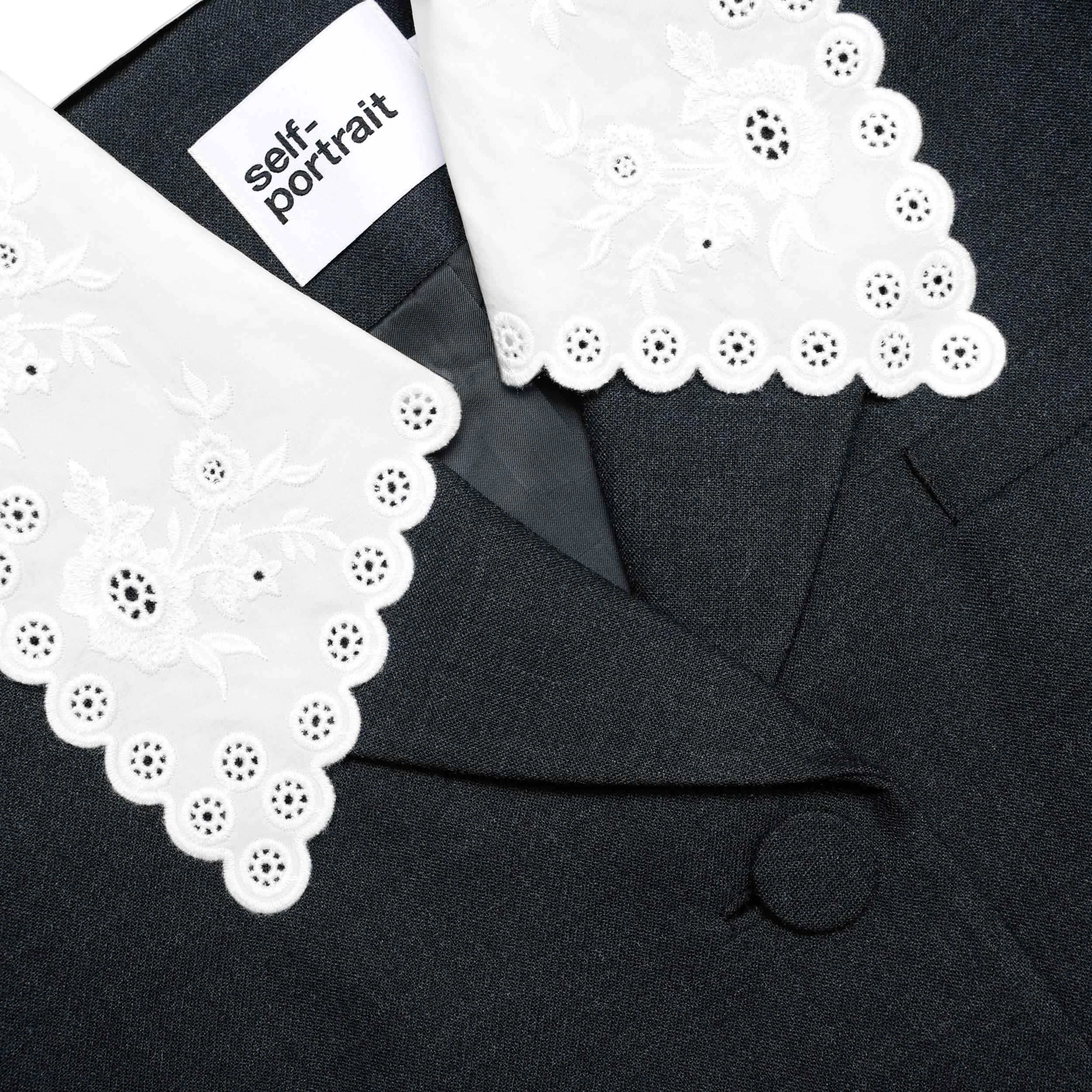 A contrast broderie anglaise collar adds artisanal detail to this grey wool jacket. Its boxy, cropped fit gives a stylish attitude, ideal for pairing with high-waisted denim and pencil skirts alike.True to sizeThis style has minimal stretchButton closure down frontFunctional pocketsMatching skirt availableModel is 5ft10/178cm and wears a size UK 6
