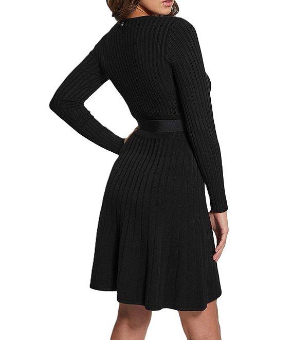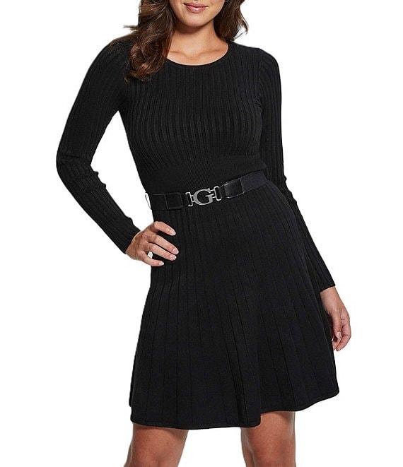 Guess Paige Belted Long Sleeve Rib Pleated Fit & Flare Sweater Dress