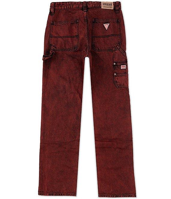 From Guess, these pants feature: Mid rise Loose fit Flat-front styling Belt loops Zip/button-front closure Pockets 32" inseam Cotton Machine wash/tumble dry Imported.