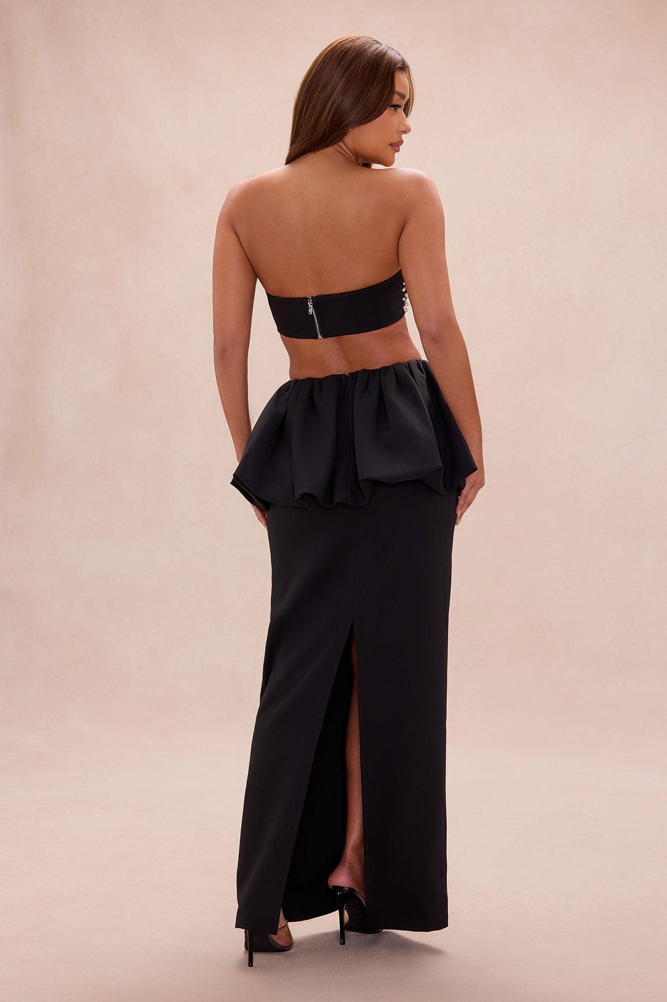 Available In Black. Skirt Ensemble Strapless Bandeau Top Straight Neckline Grip Tape , Padded Bra Cups Embellished Back Zipper Closure Maxi Skirt Bubble Hem Detail Back Slit Hidden Back Zipper Closure Non Stretch Self: 95% Polyester 5% Spandex Lining: 100% Polyester Imported