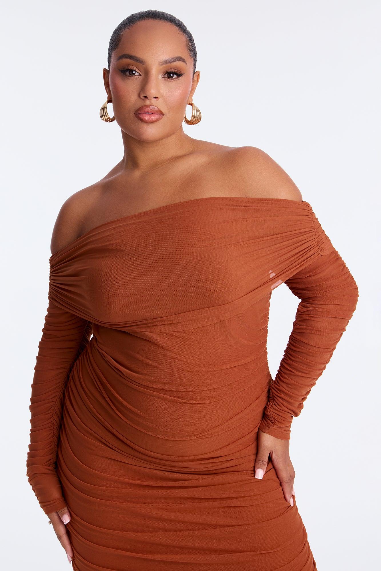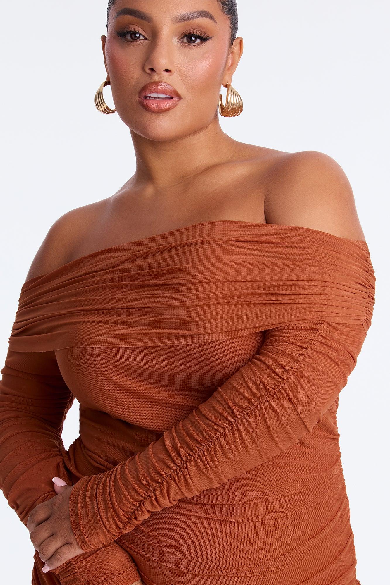 Available In Black And Camel. Mesh Bandage Midi Dress Off Shoulder Long Sleeve Fold Over Ruched Zipper Length Measured Flat = 43" Self : 95% Polyester 5% Spandex Contrast : 95% Nylon 5% Spandex Imported