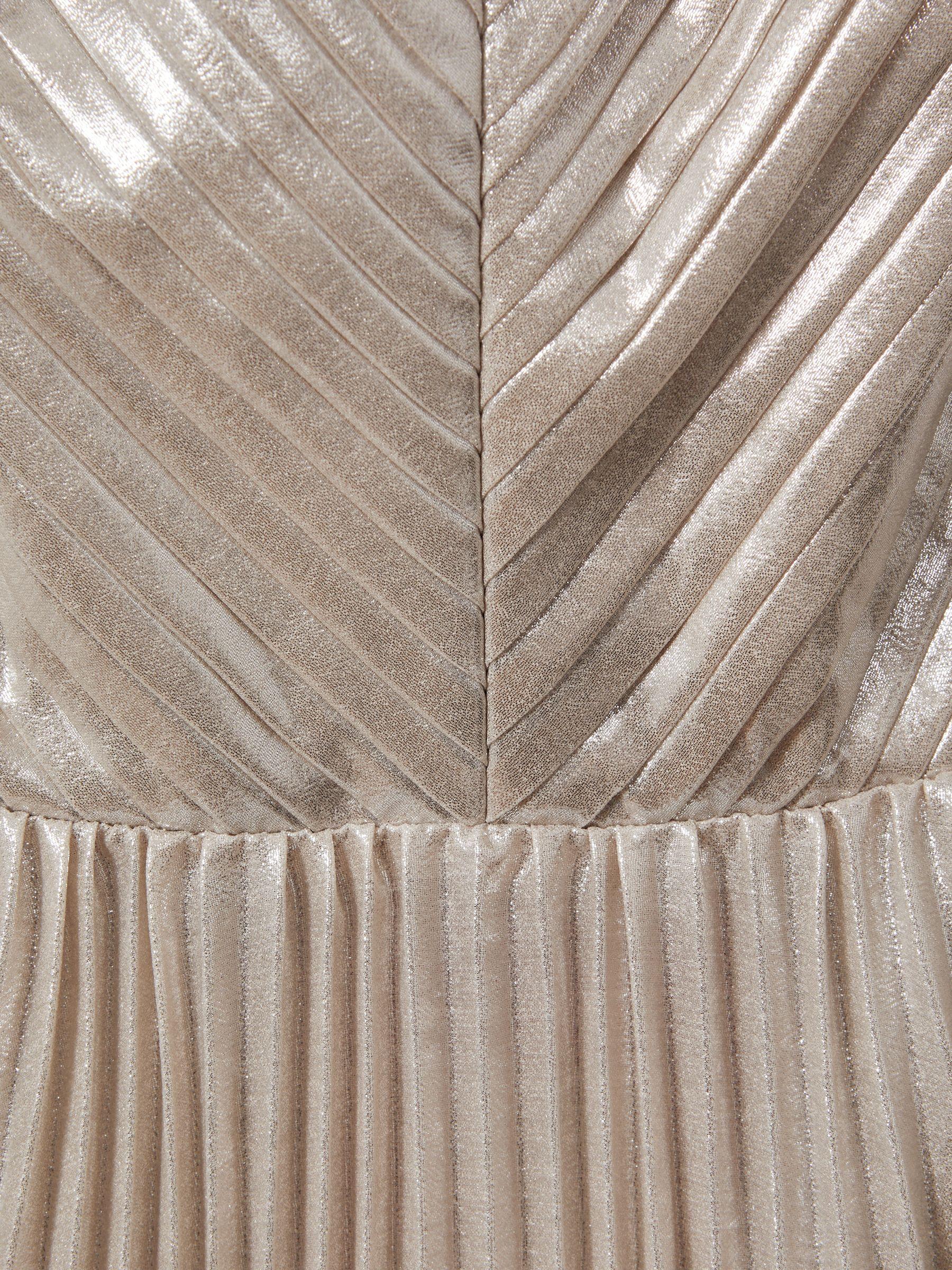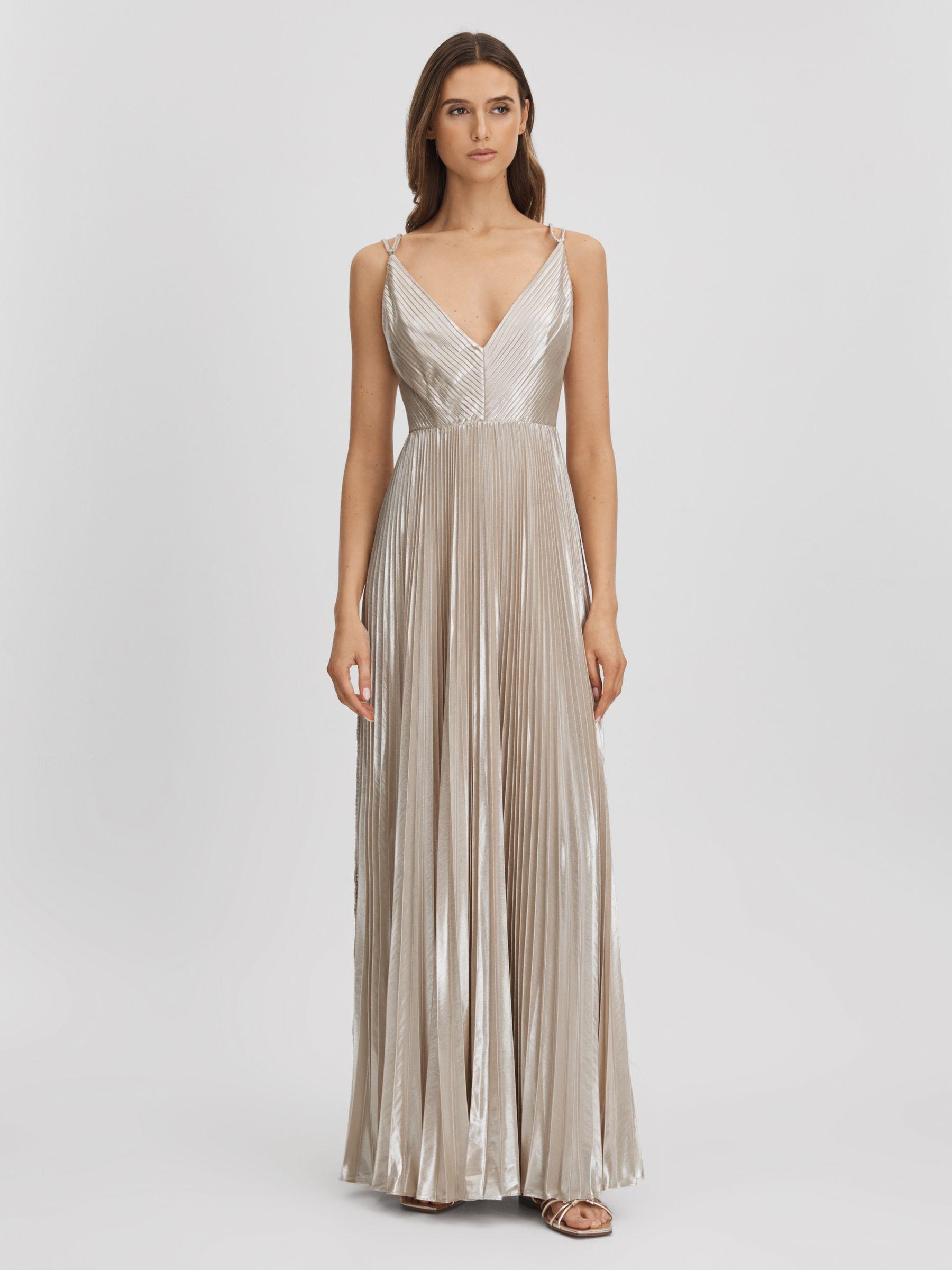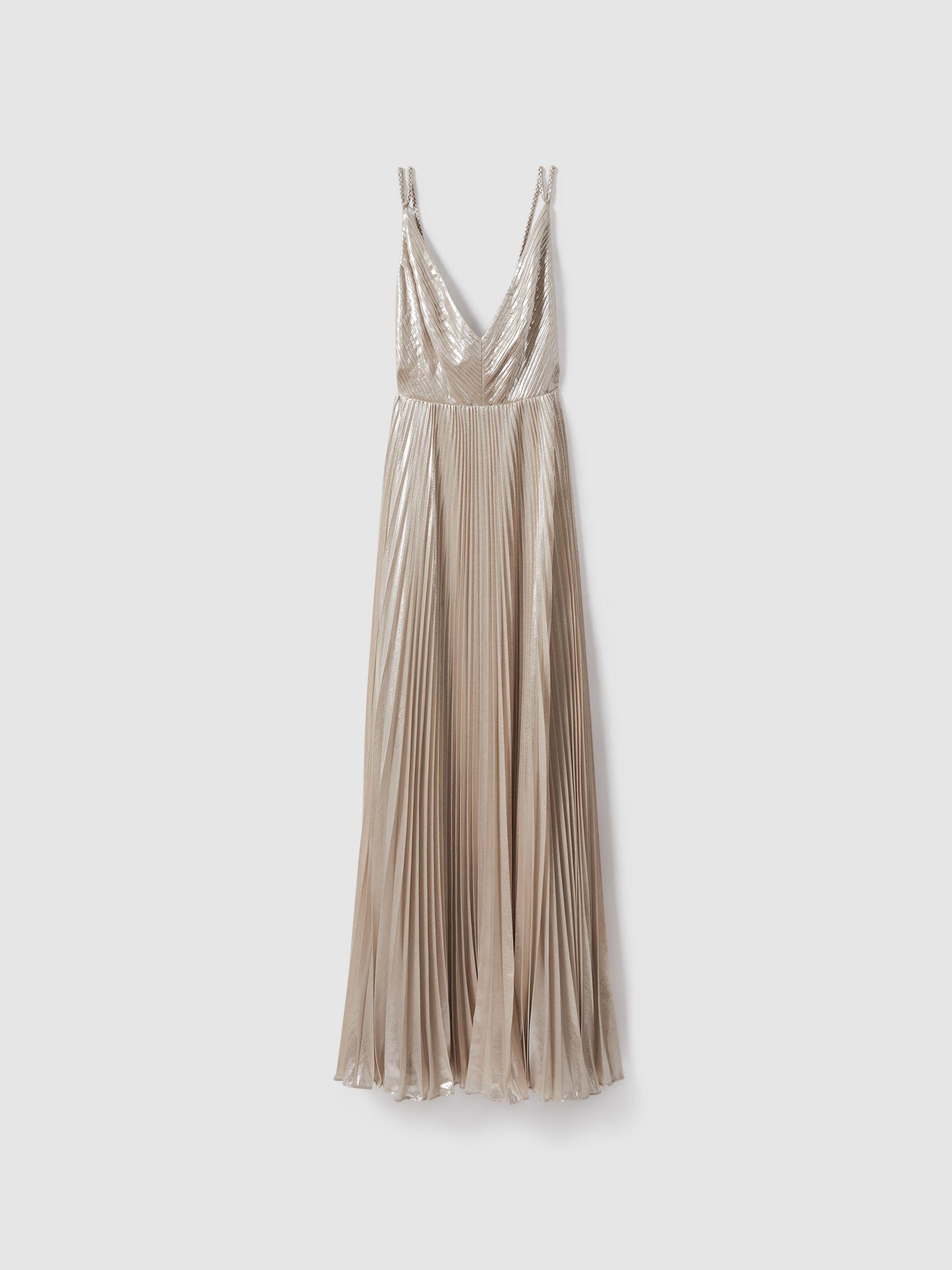 This maxi dress is fashioned from a smooth, reflective fabric and arranged with tight pleats at the bust. The pleats soften through the length for a natural flared skirt. Metallic, plaited ropes thread across the back and around the waist. Metallic fabrication Pleated Plunge neckline Plaited rope detailing Zip-closure to reverse Maxi length Halston, curated by Reiss, is a collection of 70s-inspired modern glamour gowns that remain true to our style philosophy. Signature occasionwear styles perfectly complement your existing Reiss wardrobe.
