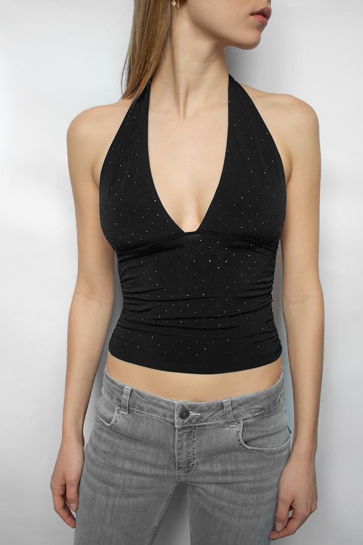 Halter neck top, with rhinestones, sleeveless, regular length, slim fit.