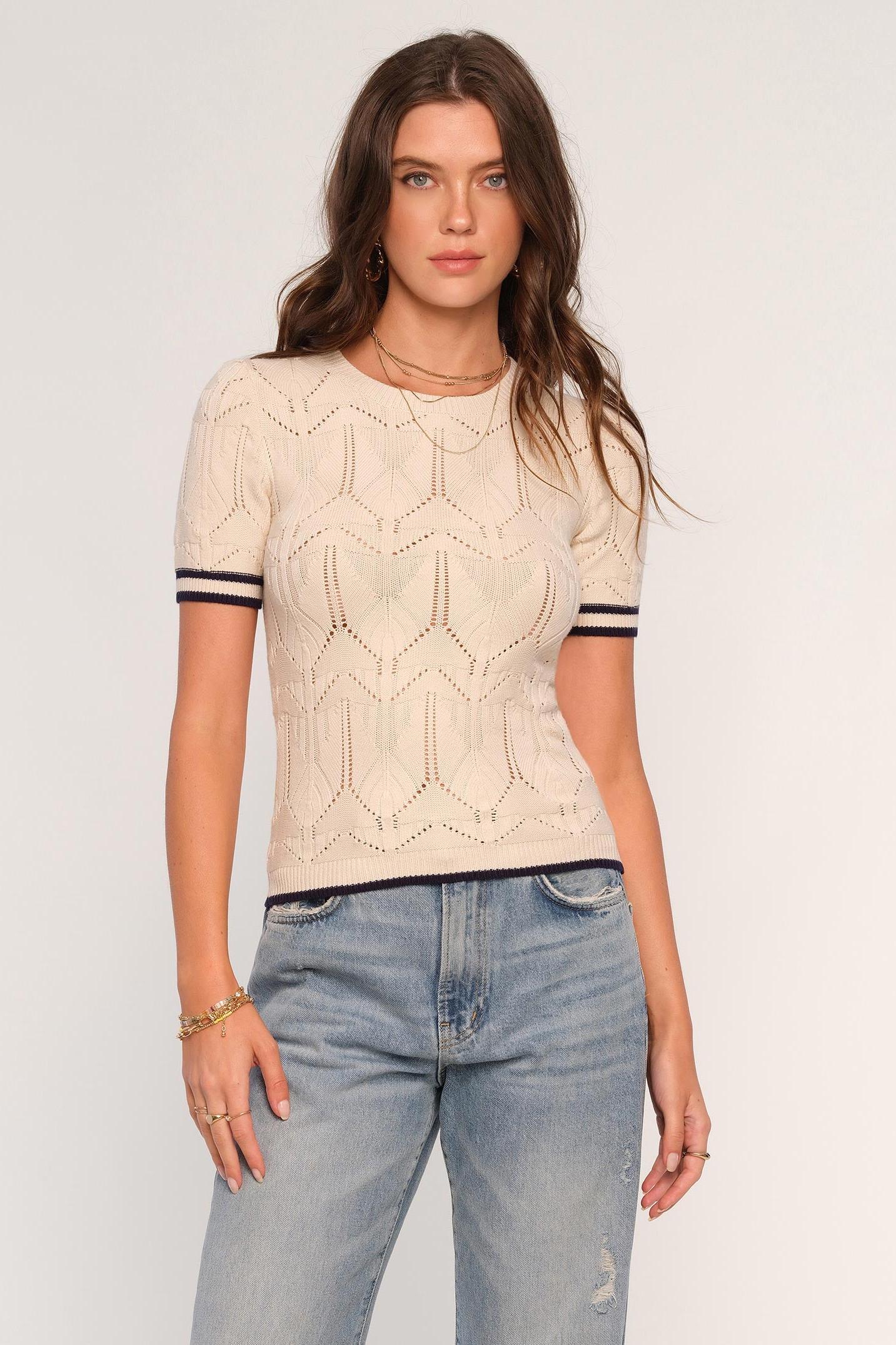 The Halton Top is a cute, spring knit for any occasion. It features a geometric stitch pattern, and contrast tipping at the sleeve opening. It has a slim fit, which makes it perfect for wearing with baggy jeans.