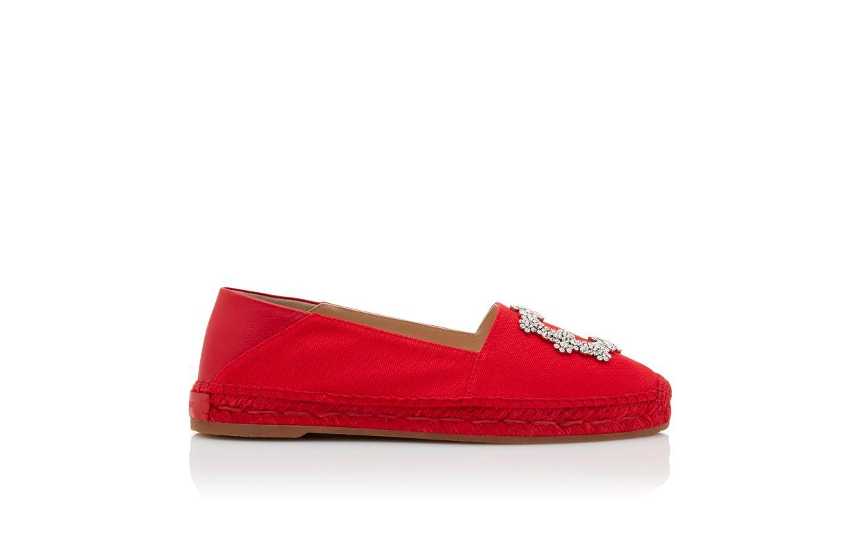 Red cotton round toe espadrilles featuring decorative embellished buckle with Swarovski crystals, slip-on design and lamb nappa collapsible counter. Finished with platform straw detailing and flat rubber sole.