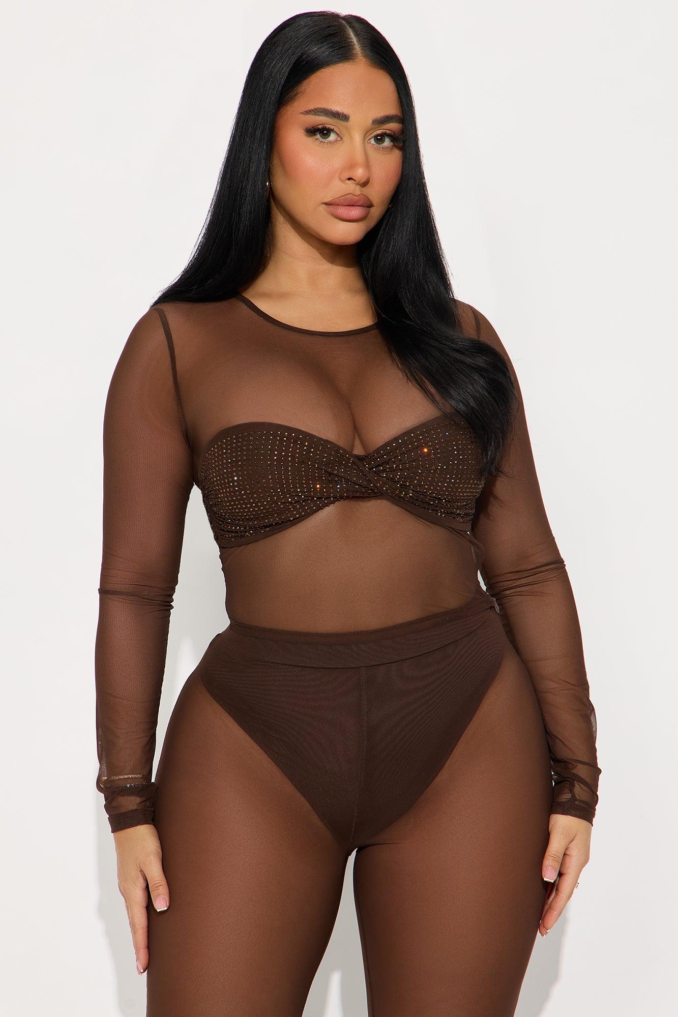 Available In Chocolate. 2 Piece Ensemble Long Sleeve Top And Flare Pant Set Stretch 35" Inseam Panty Lining Elastic Waistband Final Sale Self: 82% Nylon 18% Spandex Lining: 95% Polyester 5% Spandex Imported California Proposition 65WARNING: Cancer and Reproductive Harm - www.P65Warnings.ca.gov.