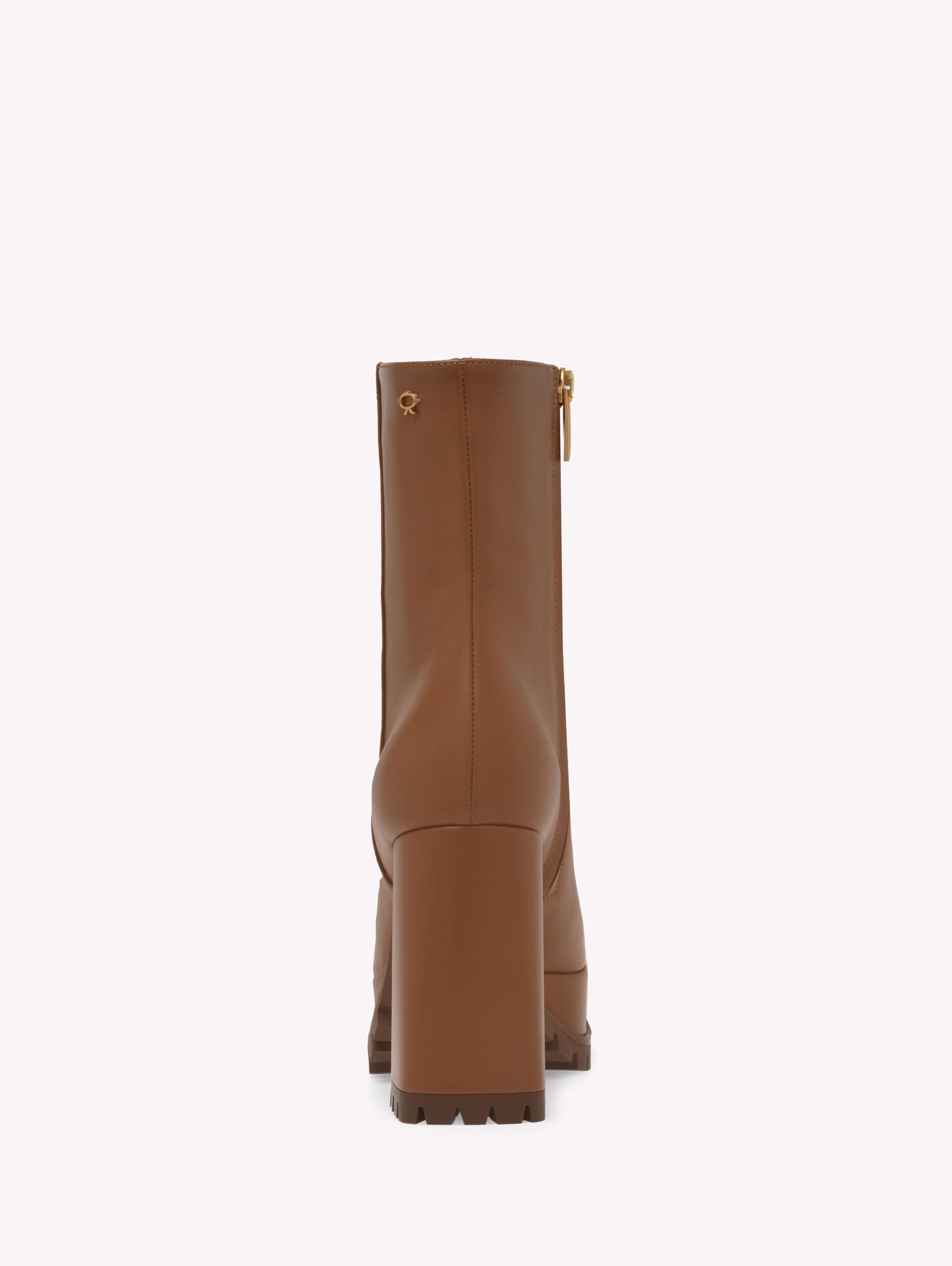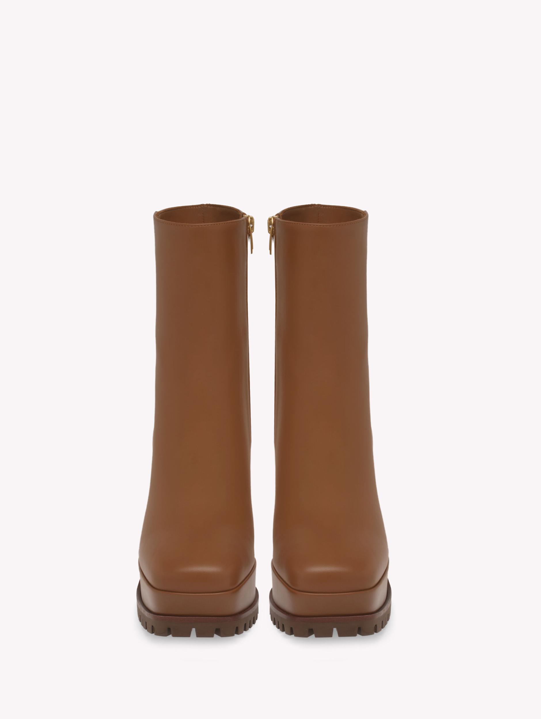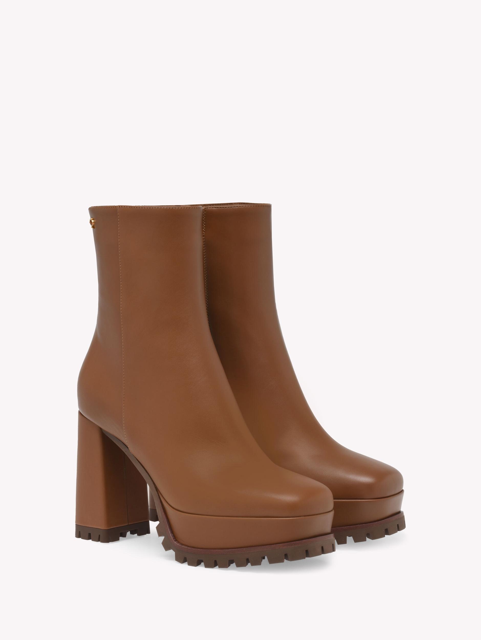 Enriched with the mini Ribbon detail, Harlem is a squared-toe leather bootie with a rubber lug sole and a zip in the inside. The platform measures 35mm wheres the heel measures 105mm. Handmade in Italy.