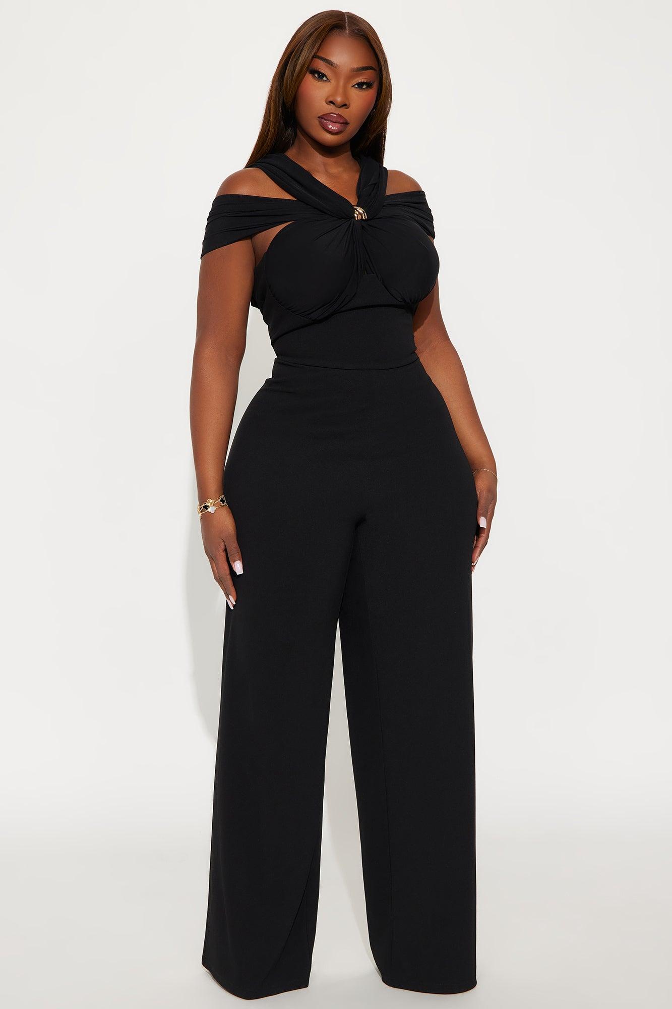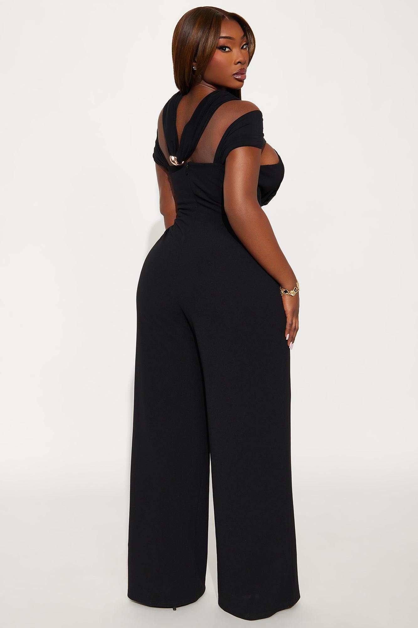 Available In Black. Jumpsuit Stretch Short Sleeve Back Zip Closure Wide Leg 31" Inseam Shell1: 95%Polyester 5%Spandex Shell2: 95%Nylon 5%Spandex Lining: 100%Polyester Imported California Proposition 65WARNING: Cancer and Reproductive Harm - www.P65Warnings.ca.gov.
