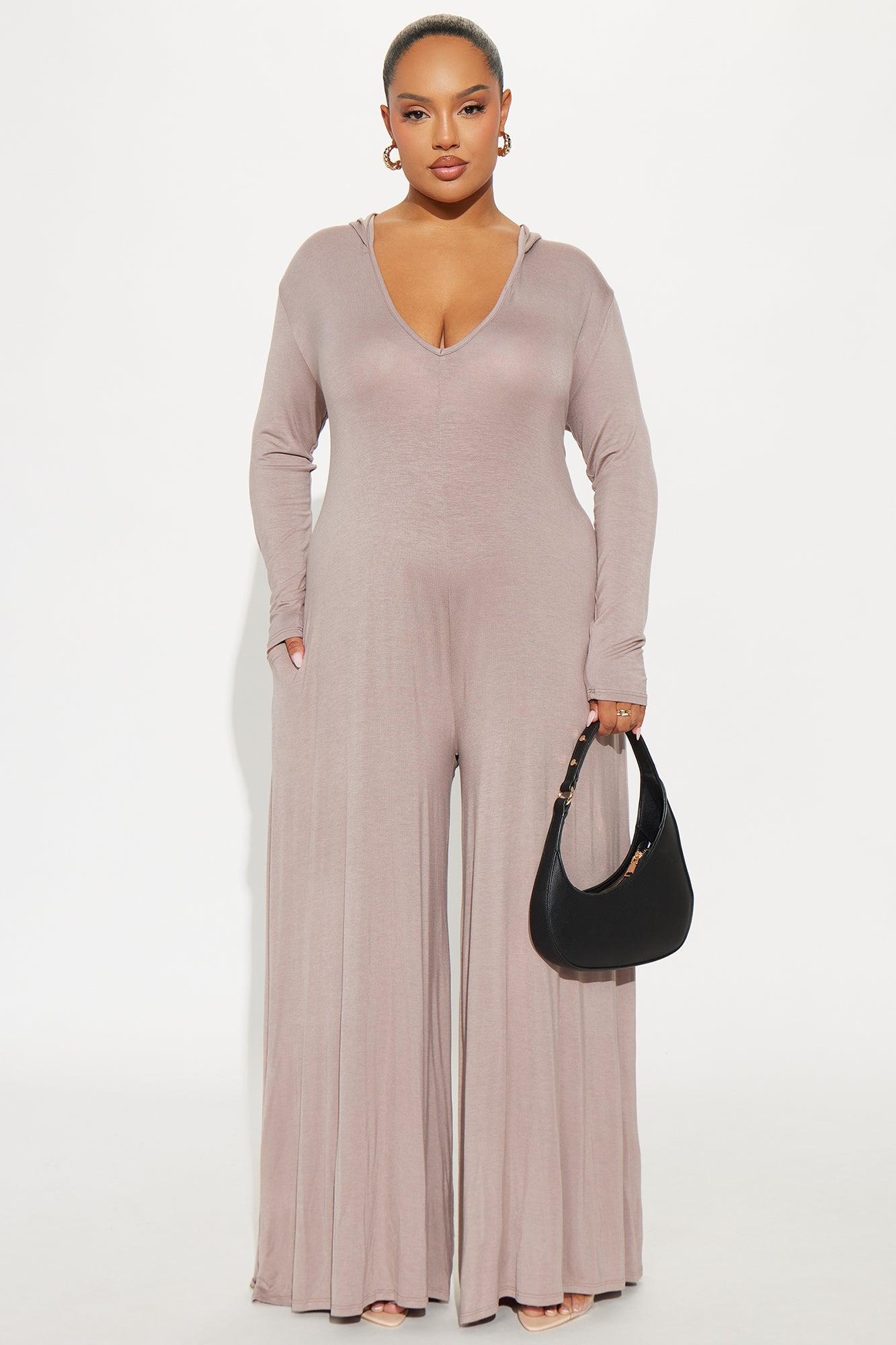 Available In Charcoal And Mocha. Jumpsuit Stretch Long Sleeve Wide Leg Jumpsuit V-Neck Wide Leg Hooded Side Pockets 32" Inseam Self: 95% Rayon 5% Spandex Imported