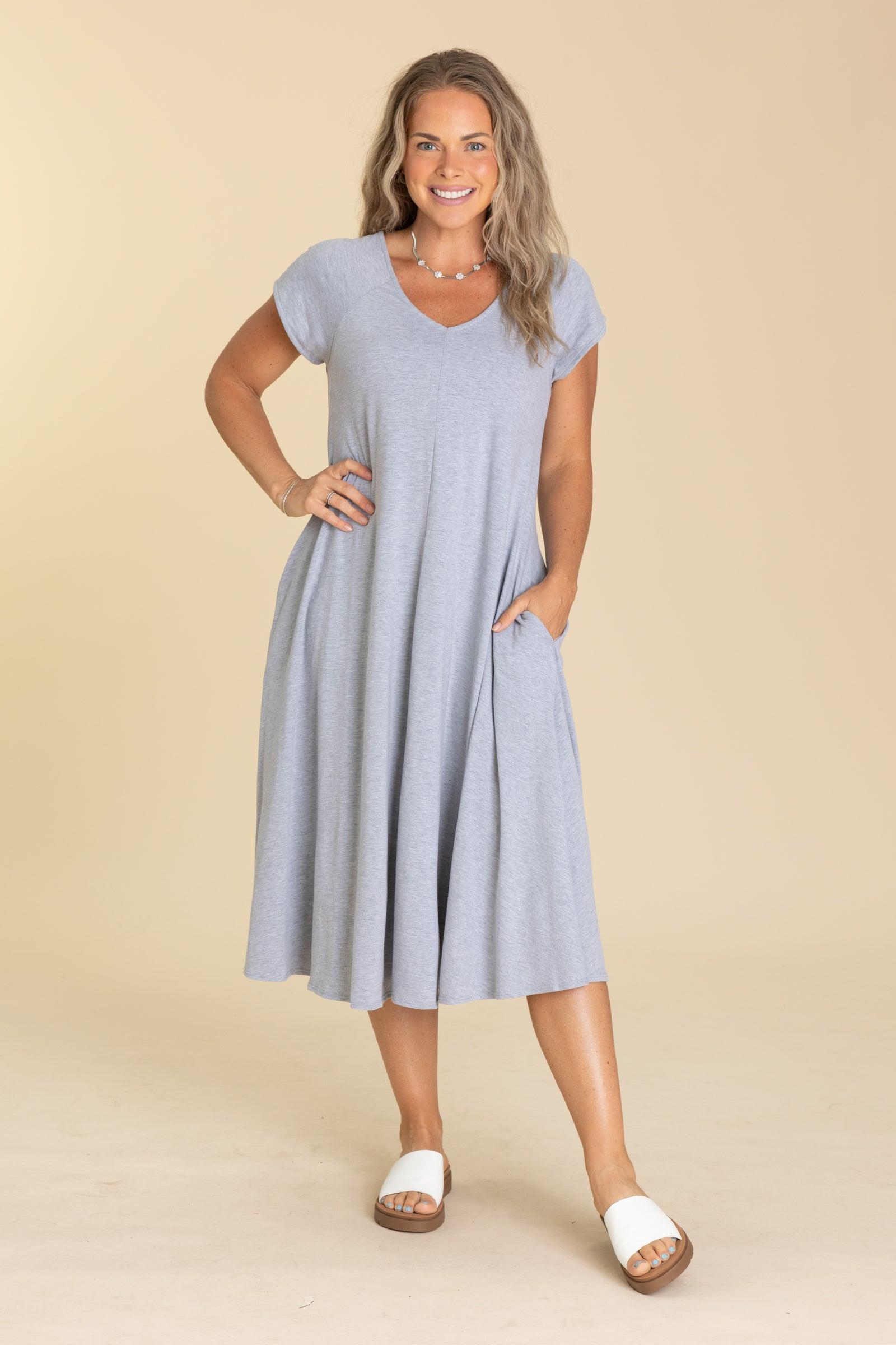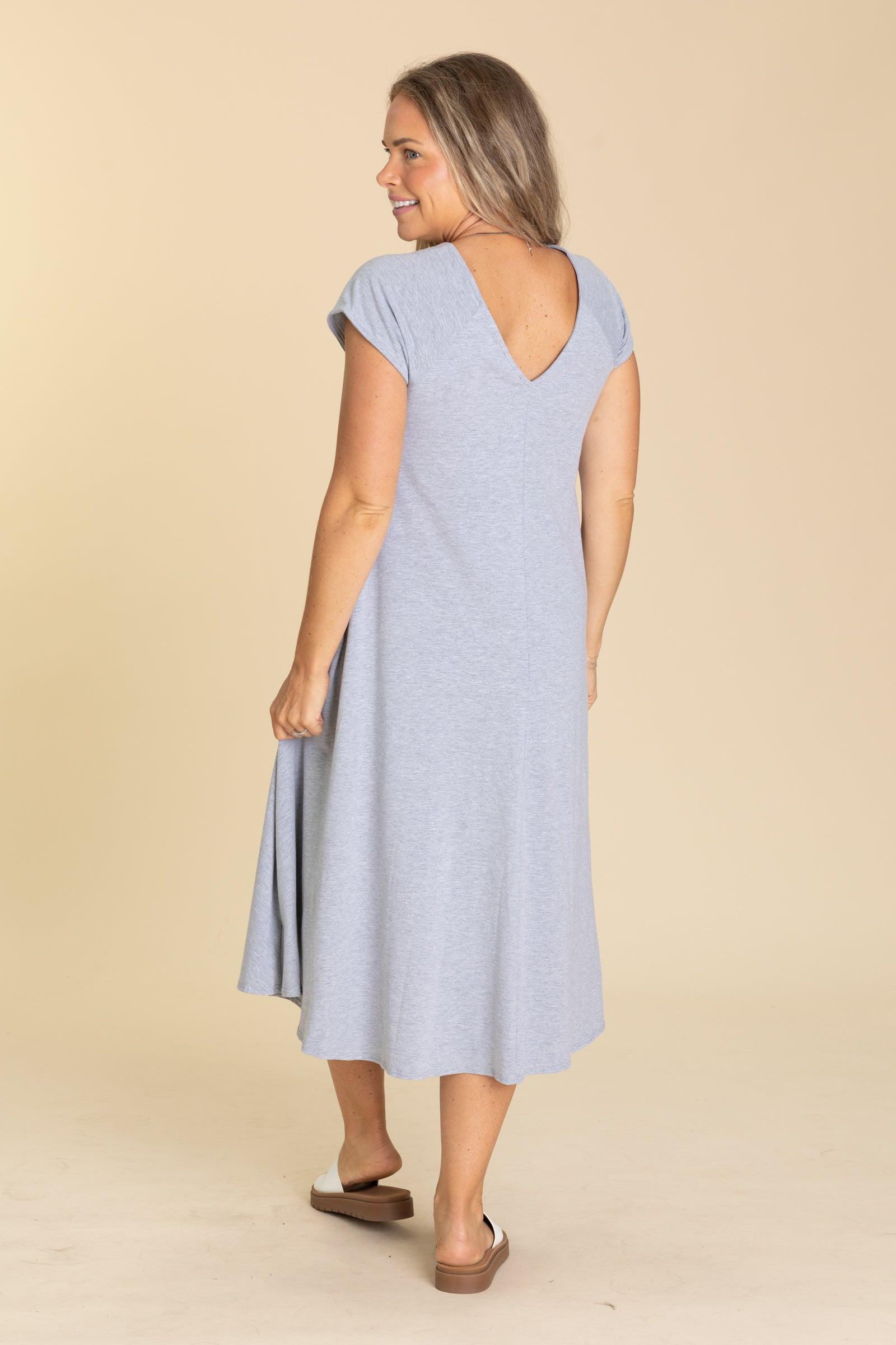 Product Details Colors: Heather Grey Print: Solid Neckline: V-Neck Sleeve: Short Sleeve Hemline: Straight Brand: Easel Material and Care 95% Cotton 5% Spandex Hand Wash Cold Hang/Line Dry Made in the USA Size and Fit Small: Bust 36" Waist 36" Length 45" Medium: Bust 38" Waist 38" Length 45.5" Large: Bust 40" Waist 40" Length 46" Erica is 5’7” and wearing her true size small