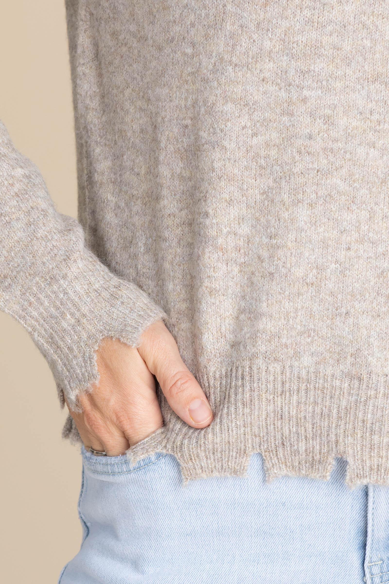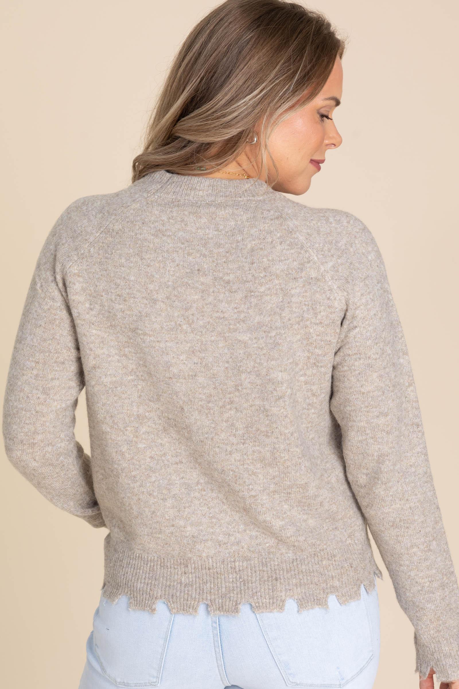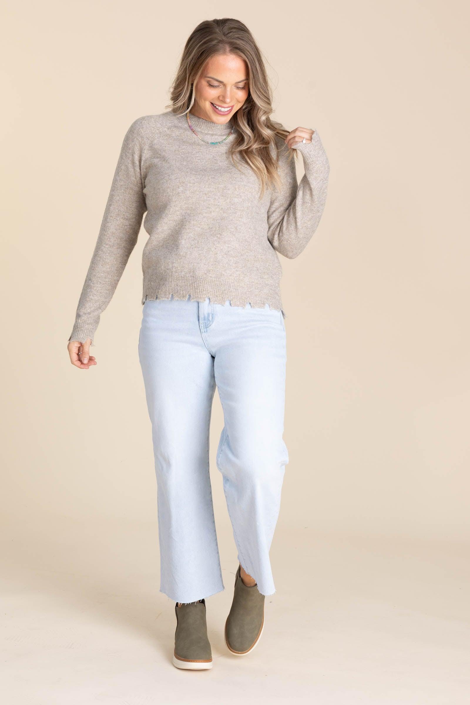 Product Details Colors: Heathered Beige Print: Heathered Neckline: Round Sleeve: Long Sleeve Hemline: Straight Brand: Staccato Material and Care 45% Acrylic 37% Polyester 15% Nylon 3% Spandex Hand Wash Cold Hang/ Line Dry Size and Fit Small: Bust 42" Waist 40" Length 22" Medium: Bust 44" Waist 42" Length 22.5" Large: Bust 46" Waist 44" Length 23" X Large: Bust 48" Waist 46" Length 23.5" Erica is 5’7” and wearing her true size small