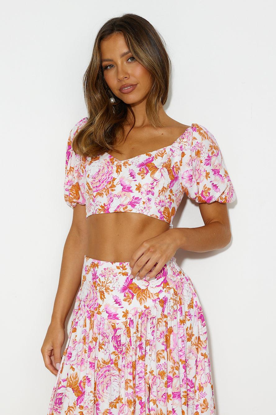 Length from top of bust to hem of size S: 19cm. Crop top. Lined. Model is a standard XS and is wearing XS. True to size. Elastic back. Non-stretchy. Puff sleeves. Cold hand wash only. Rayon/Linen. Love the look you're in. The Her Vibe Crop Top features puff sleeves in a gorgeous shade. Style with the matching skirt and heels for all the likes.