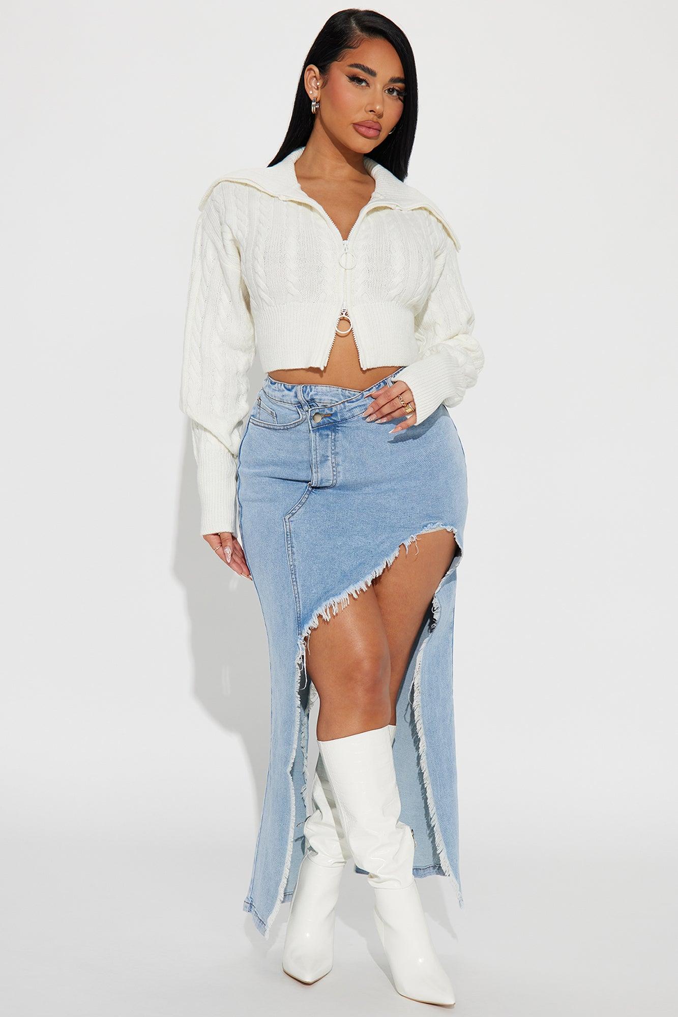 Available In Ivory. Pullover Sweater Front Zipper Cable Knit Long Sleeve 100% Acrylic Imported