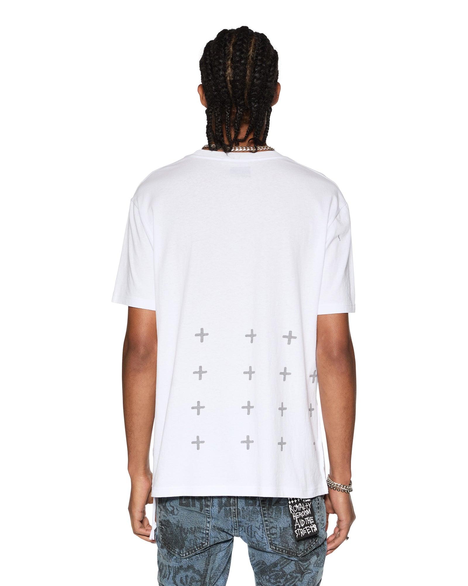 The Hero Kash Short Sleeve Tee in tru white is a regular-fitted t-shirt with short sleeves and a crew neck, featuring reverse overlocked side seam detail and a signature rats tail. Made from premium cotton jersey, it showcases screen-printed seasonal artwork at the front and back, and is finished with signature T-box branding.