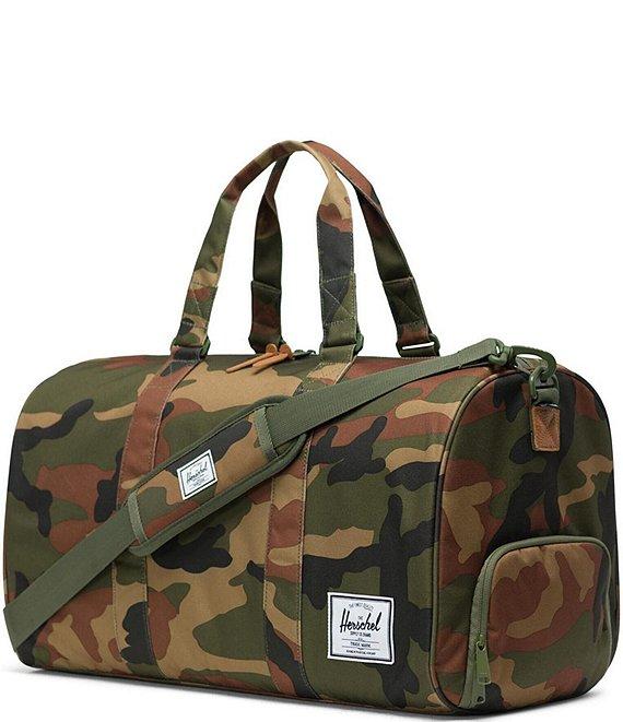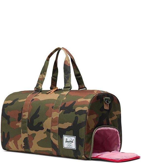 From Herschel Supply Co., the Novel Woodland Camo Duffel Bag features: 100% recycled 600D polyester, excluding trims Tonal stripe liner made from 100% recycled polyester Waterproof zippered closure protects your essentials Low profile vegan leather handles Removable smooth webbing shoulder strap with EVA padding for comfortable carrying Side sleeve pocket Signature shoe compartment Zippered internal mesh pocket Put Yourself Out There™ internal label Approx. 11.75" H x 20.5" L x 11" W Imported.
