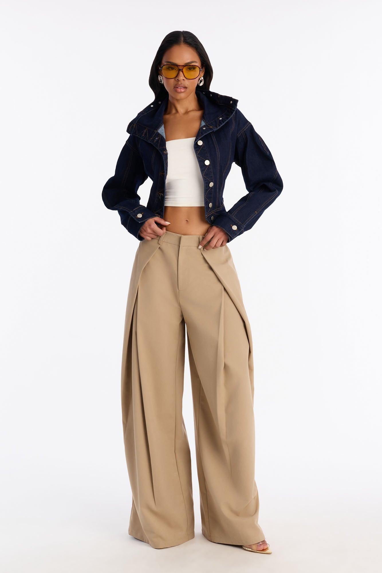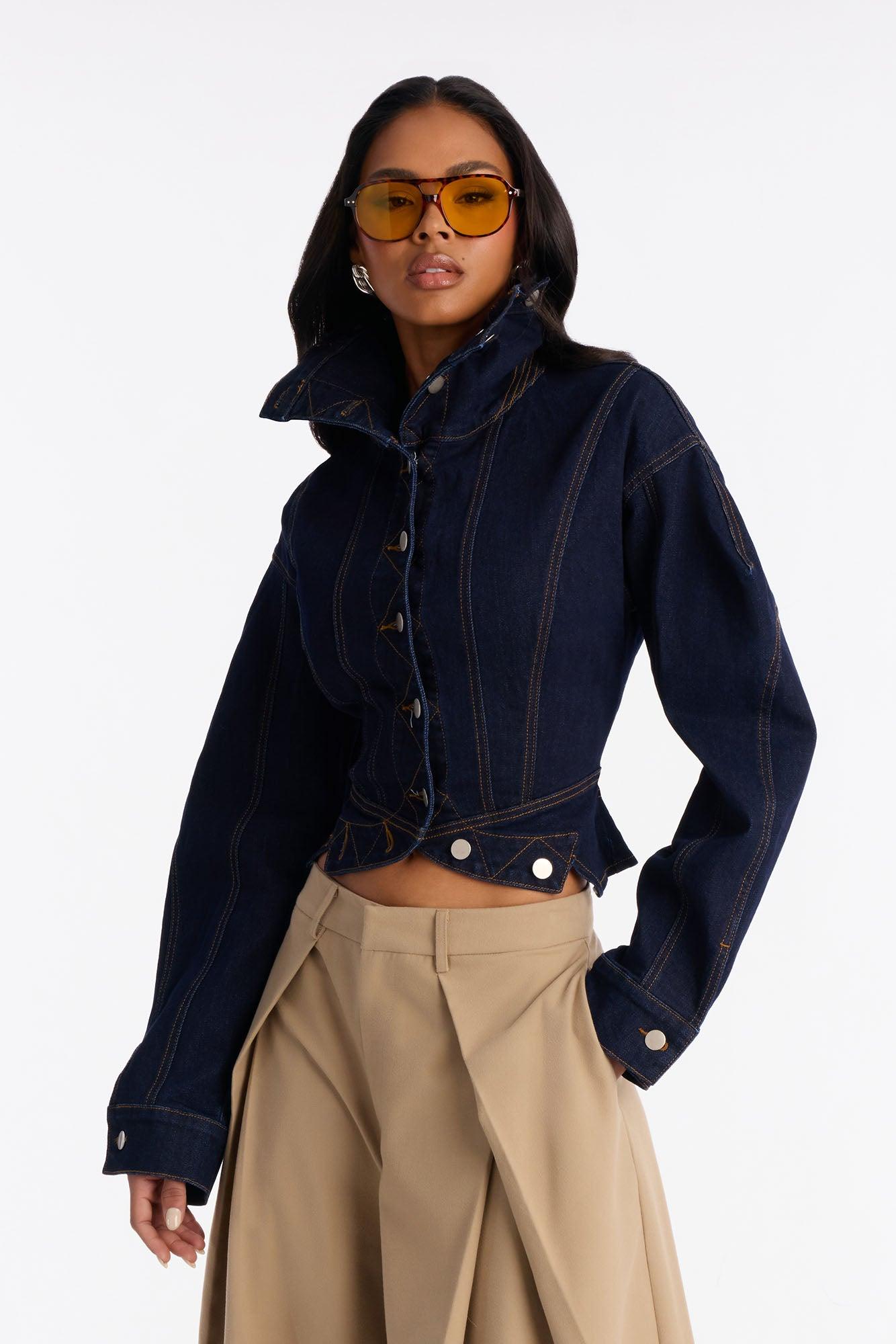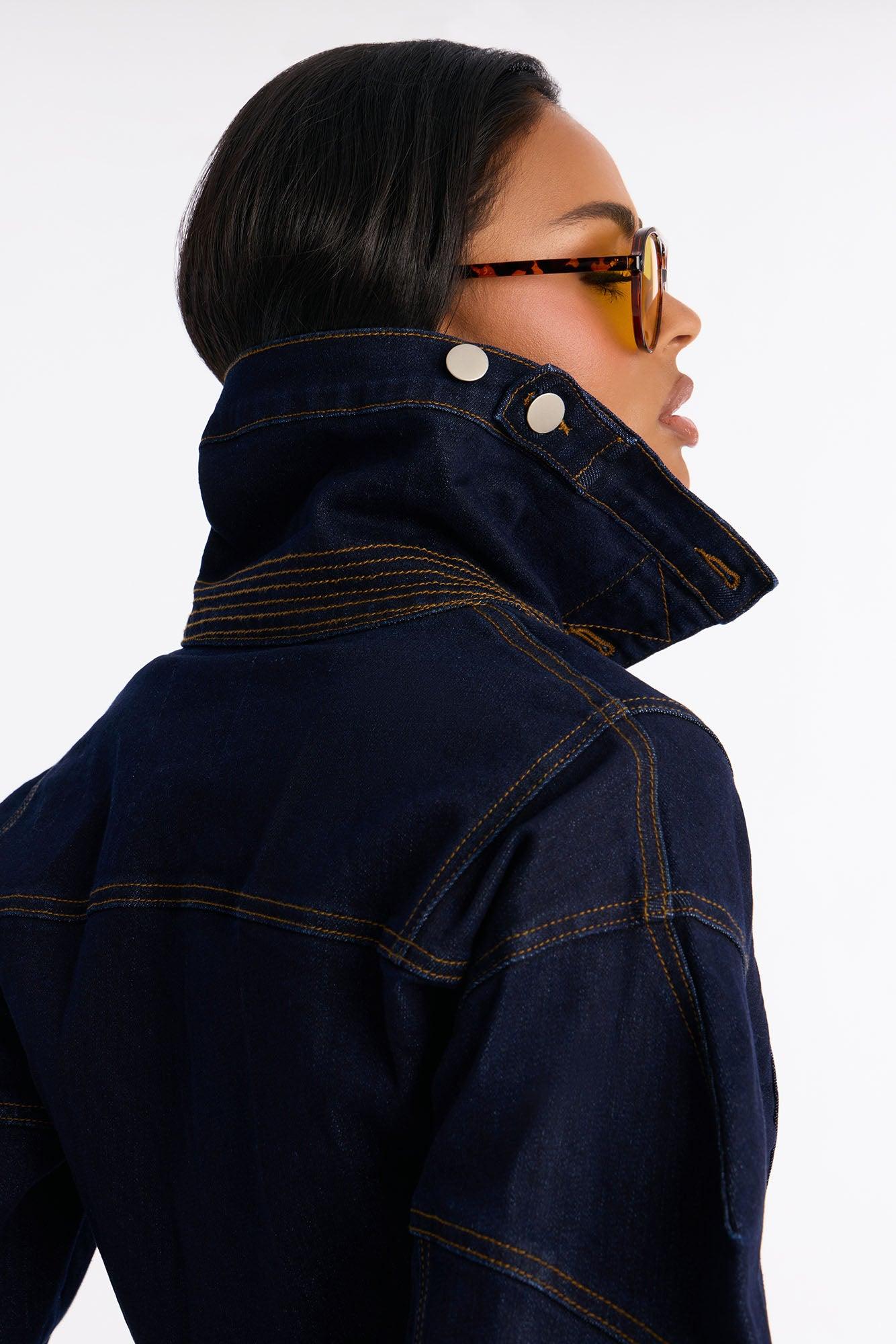 Available In Dark Wash. Denim Jacket High Neck Collar Strong Shoulders Button Closure Peplum Hem Denim Stretch Disclaimer: Due the To The Specialized Dye Process, Loose Dye Can Stain On Contact. Do Not Wash with Other Garments Self: 60% Cotton 34% Polyester 5% Viscose 1% Spandex Imported