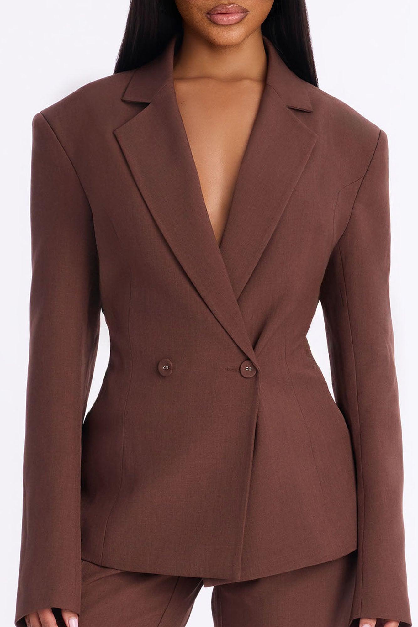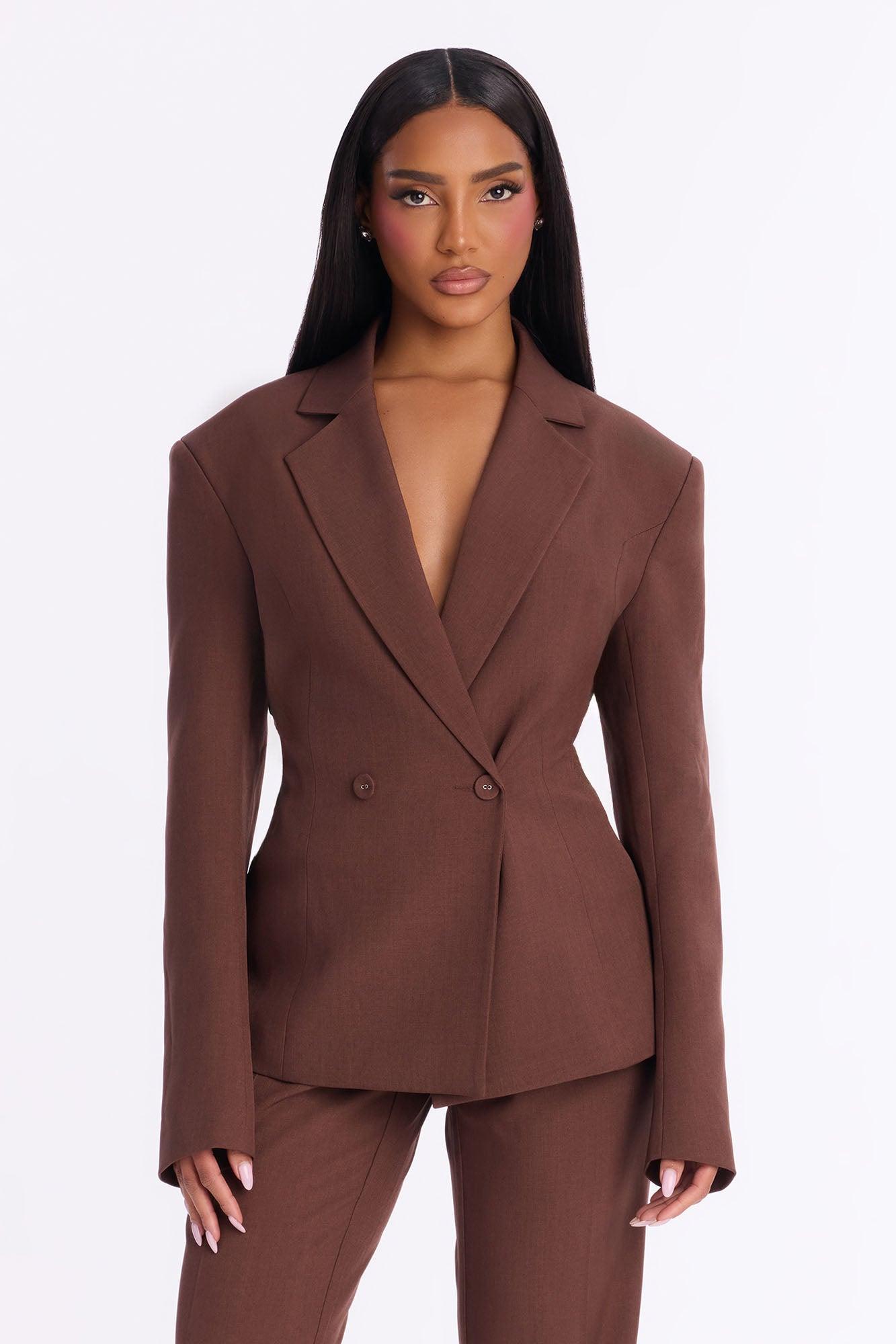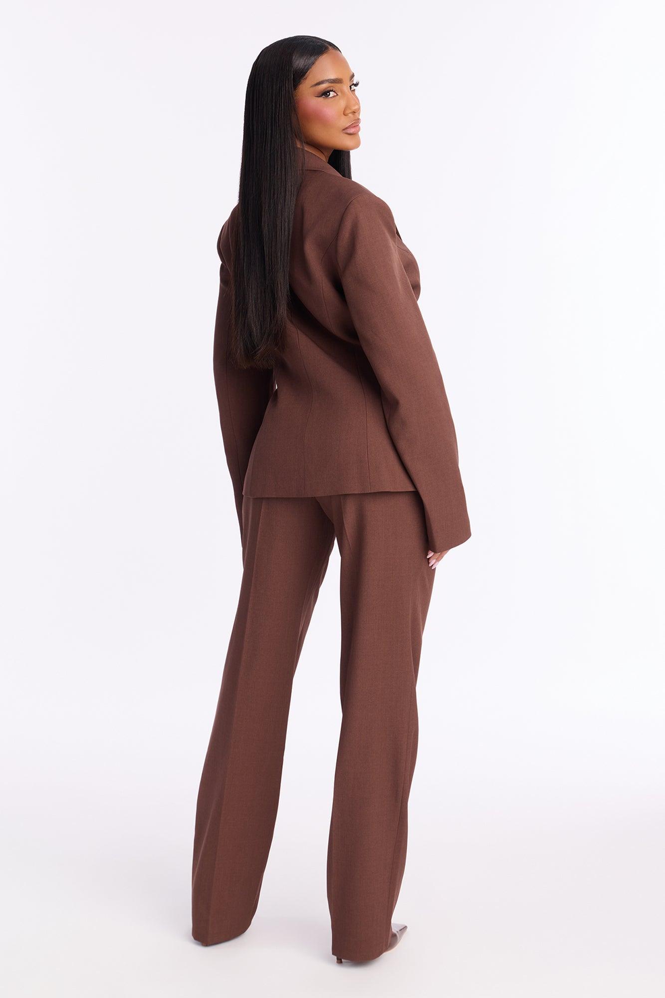 Available In Brown. 2 Piece Ensemble Blazer And Wide Leg Pant Set Moderate Stretch 33" Inseam Blazer Lining Shoulder Pads Front Clasp And Zipper Pant Closure Pockets Top Self: 96% Polyester 4% Spandex Lining: 100% Polyester Bottom: 96% Polyester 4% Spandex Imported