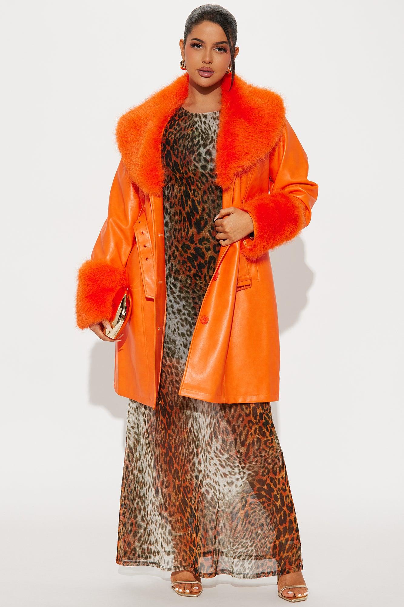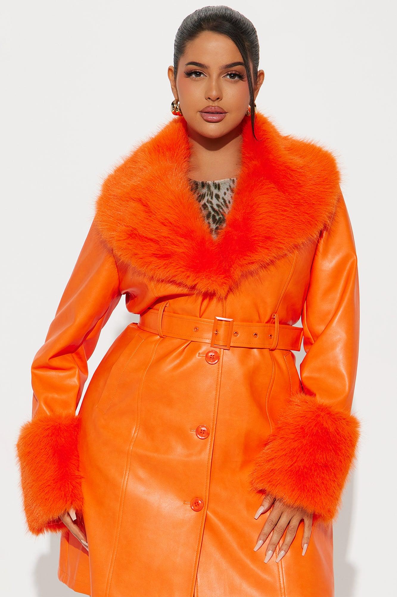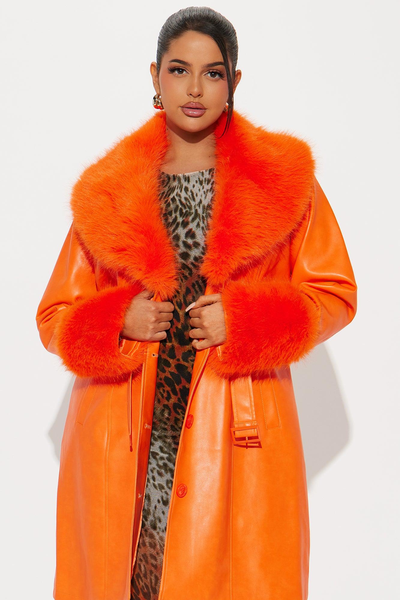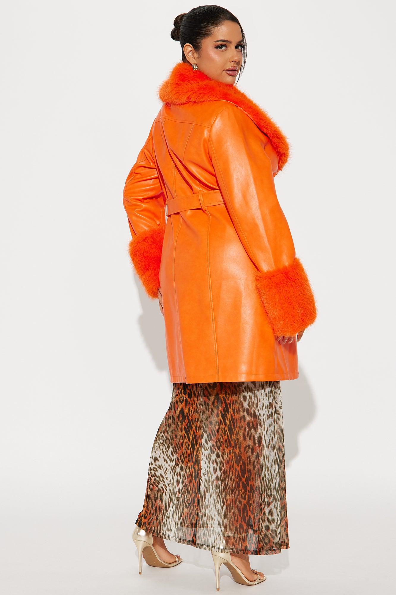 Available In Orange. Faux Leather Coat Faux Fur Trim Collar Long Sleeve Faux Fur Trim Cuffs Belted Button Closure Lined Shell/Facing: 100% Polyurethane Backing: 50% Viscose 50% Polyester Faux Fur/Lining: 100% Polyester Imported Available In Plus Sizes California Proposition 65WARNING: Cancer and Reproductive Harm - www.P65Warnings.ca.gov.