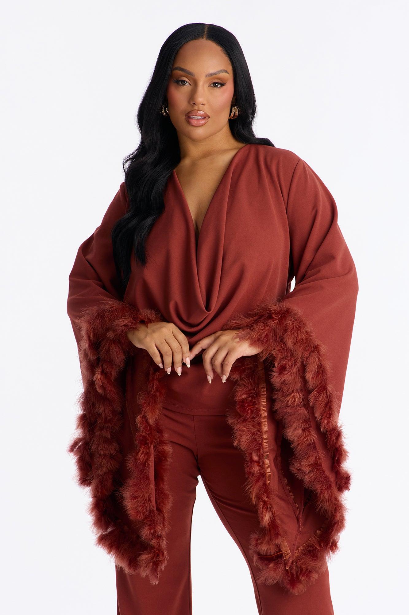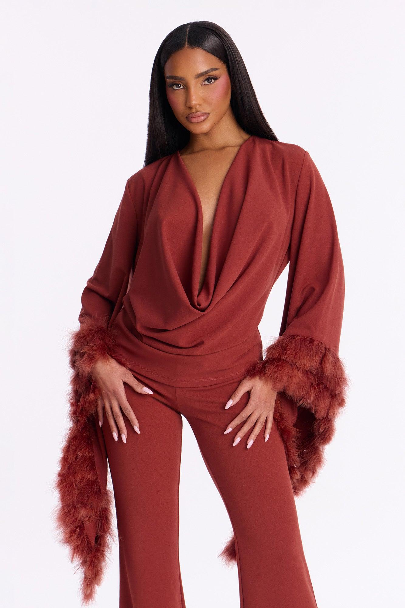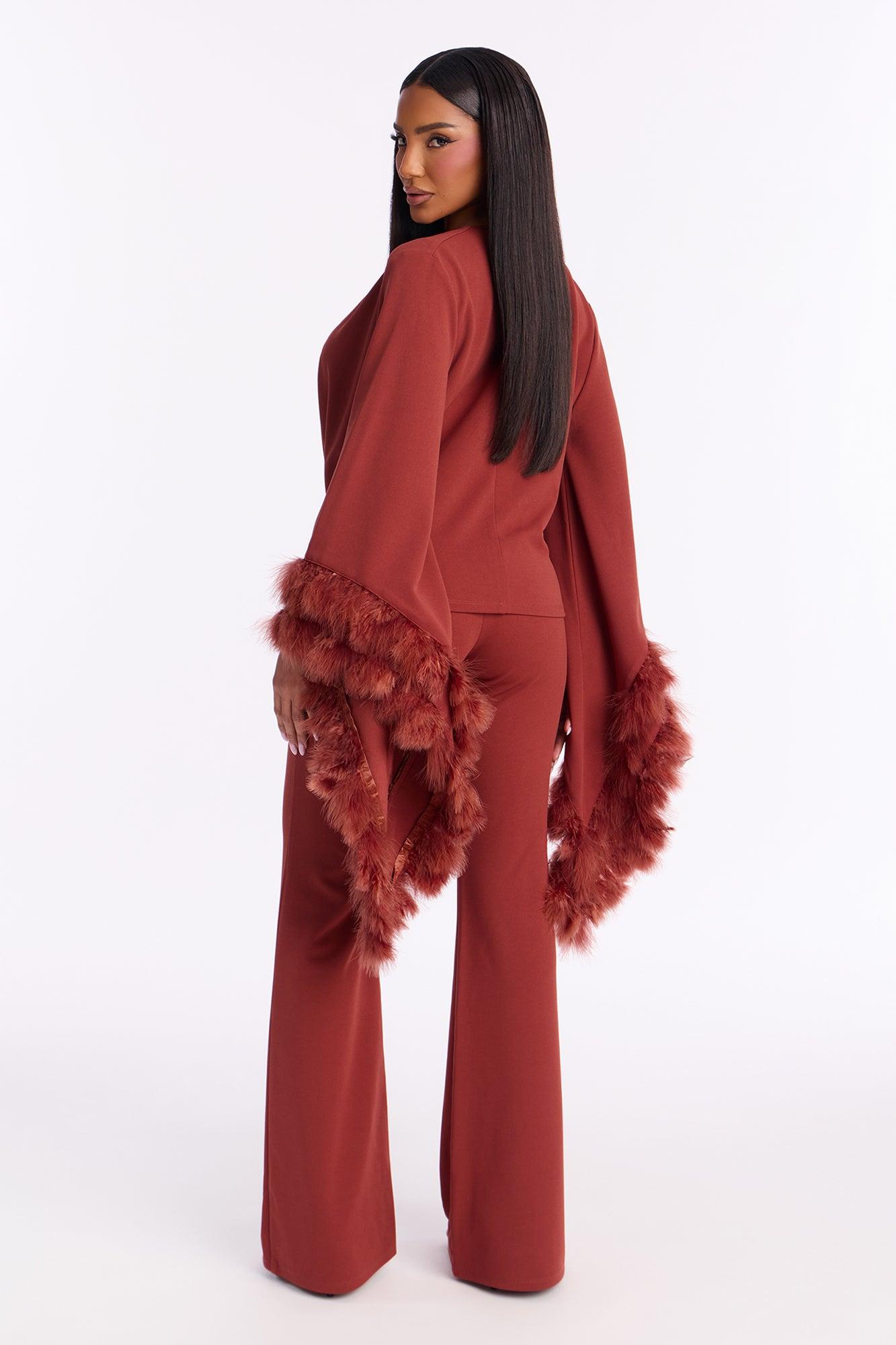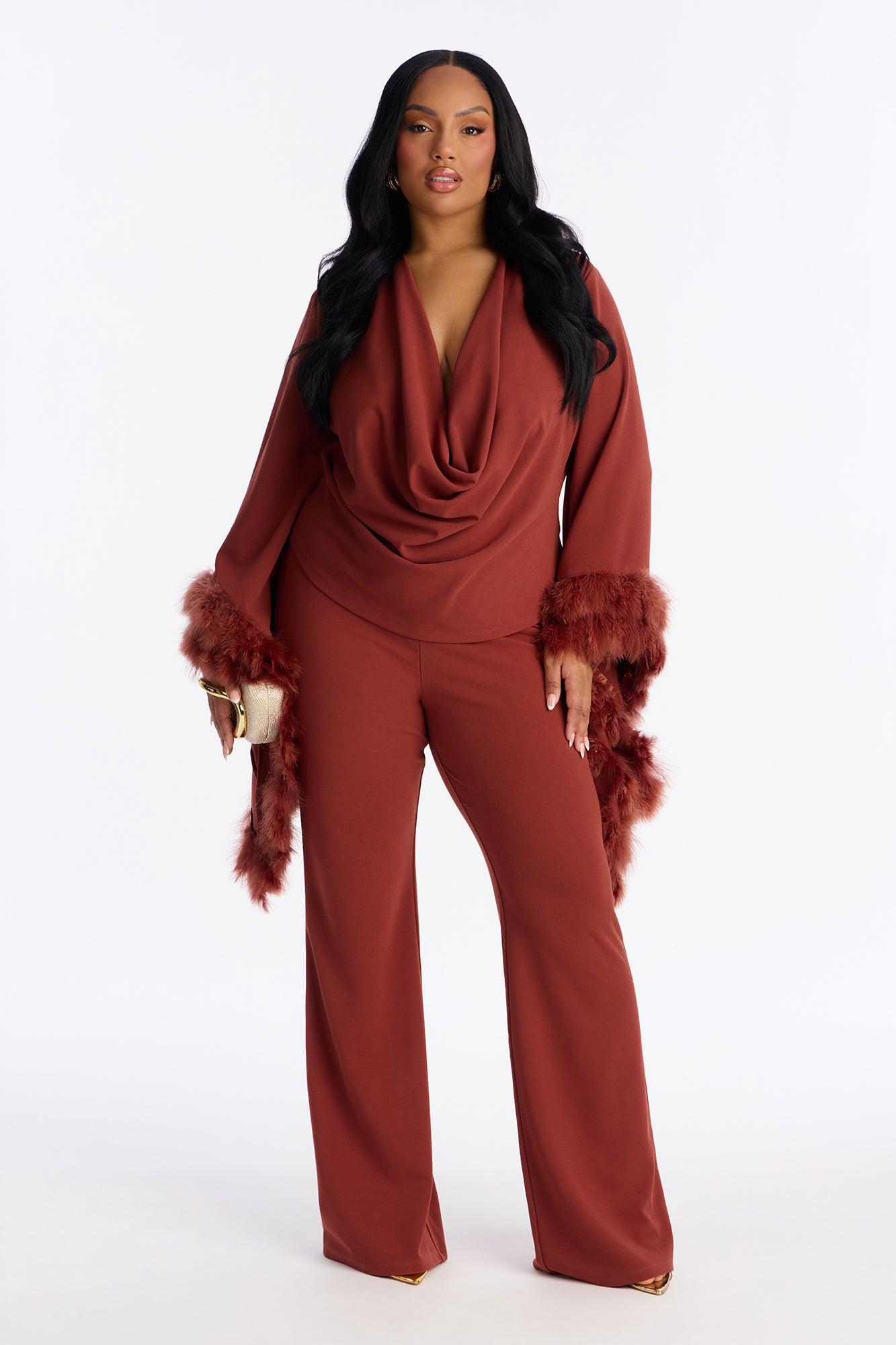 High Maintenance Drama Sleeve Feathered Pant Set - Marsala Female