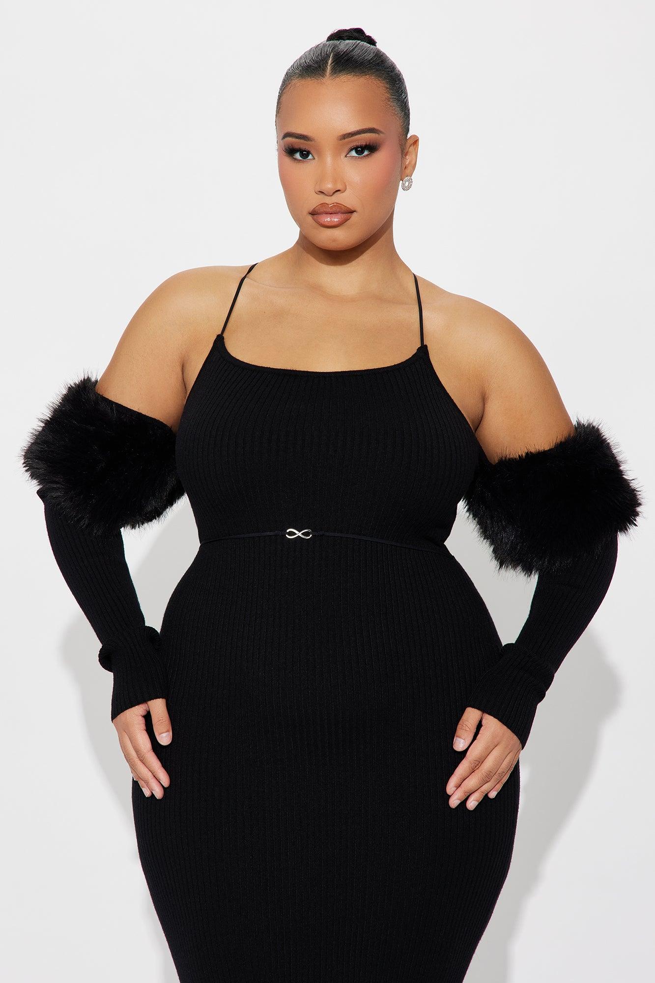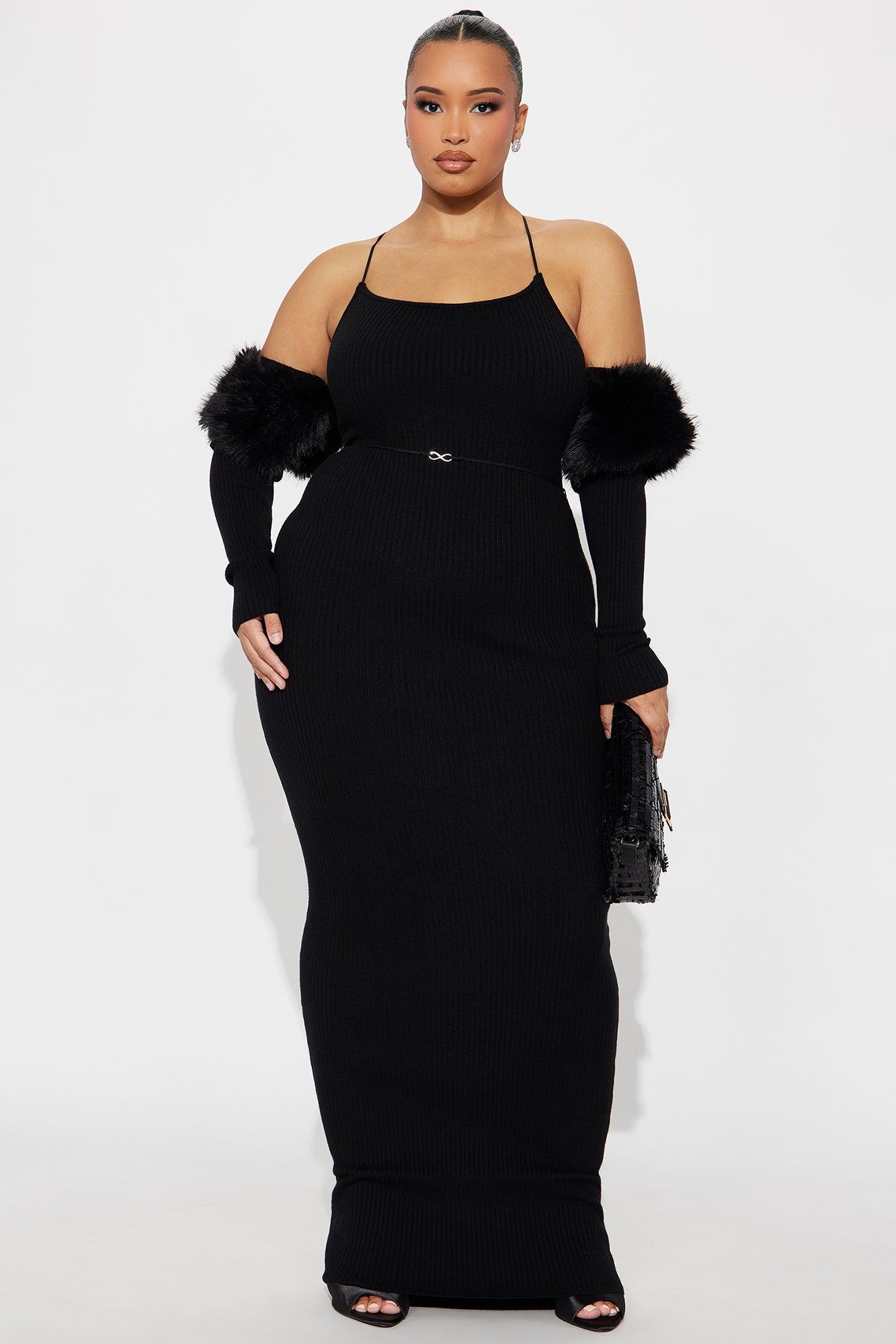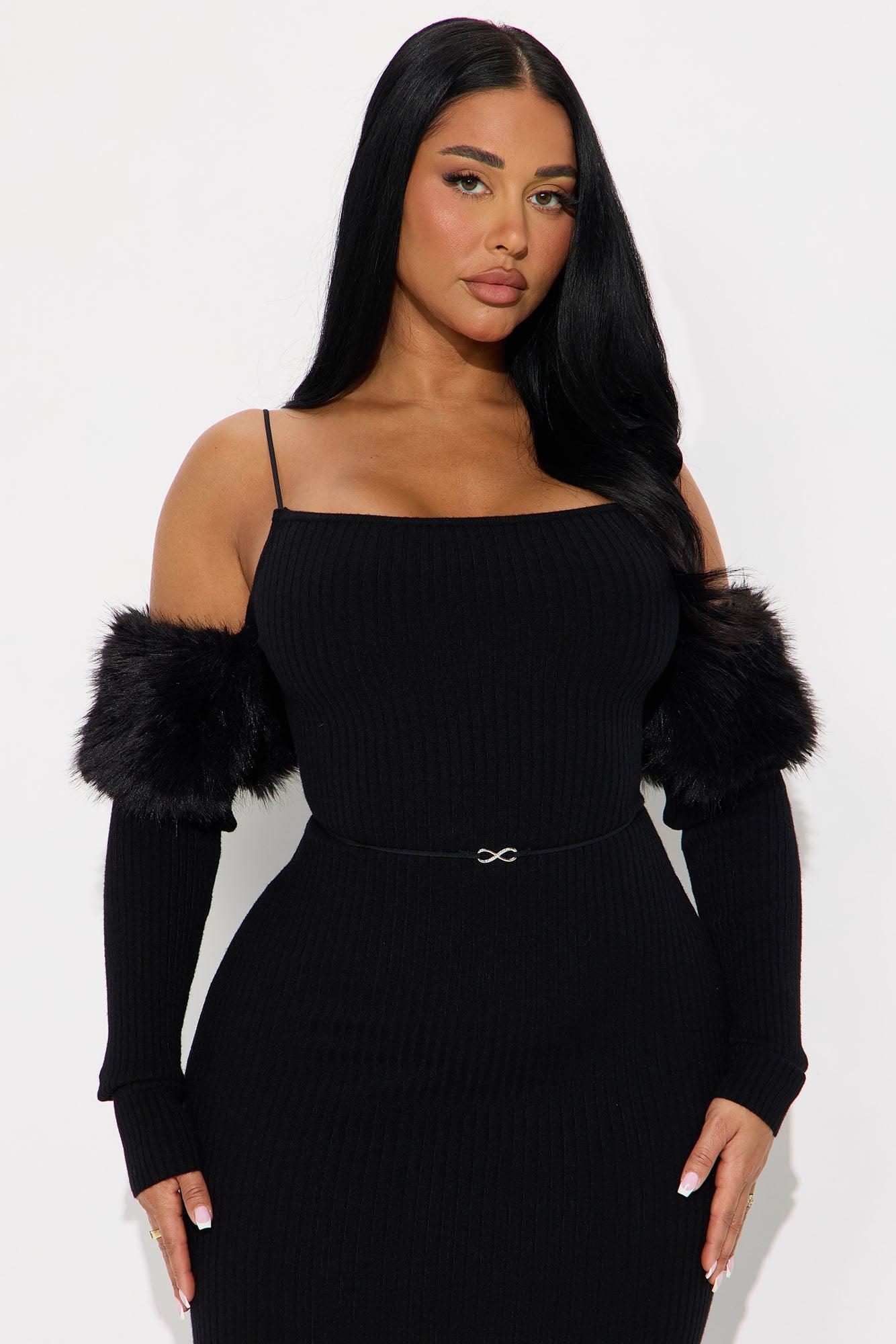Available In Black And Light Pink. Ribbed Maxi Dress Long Sleeve Off The Shoulder Removable Fur Trim Belt detail Stretch Disclaimer: Feather Fall Out May Happen. Shell- 50% Rayon 30% Polyester 20% Nylon Fur Lining- 100% Polyester Imported