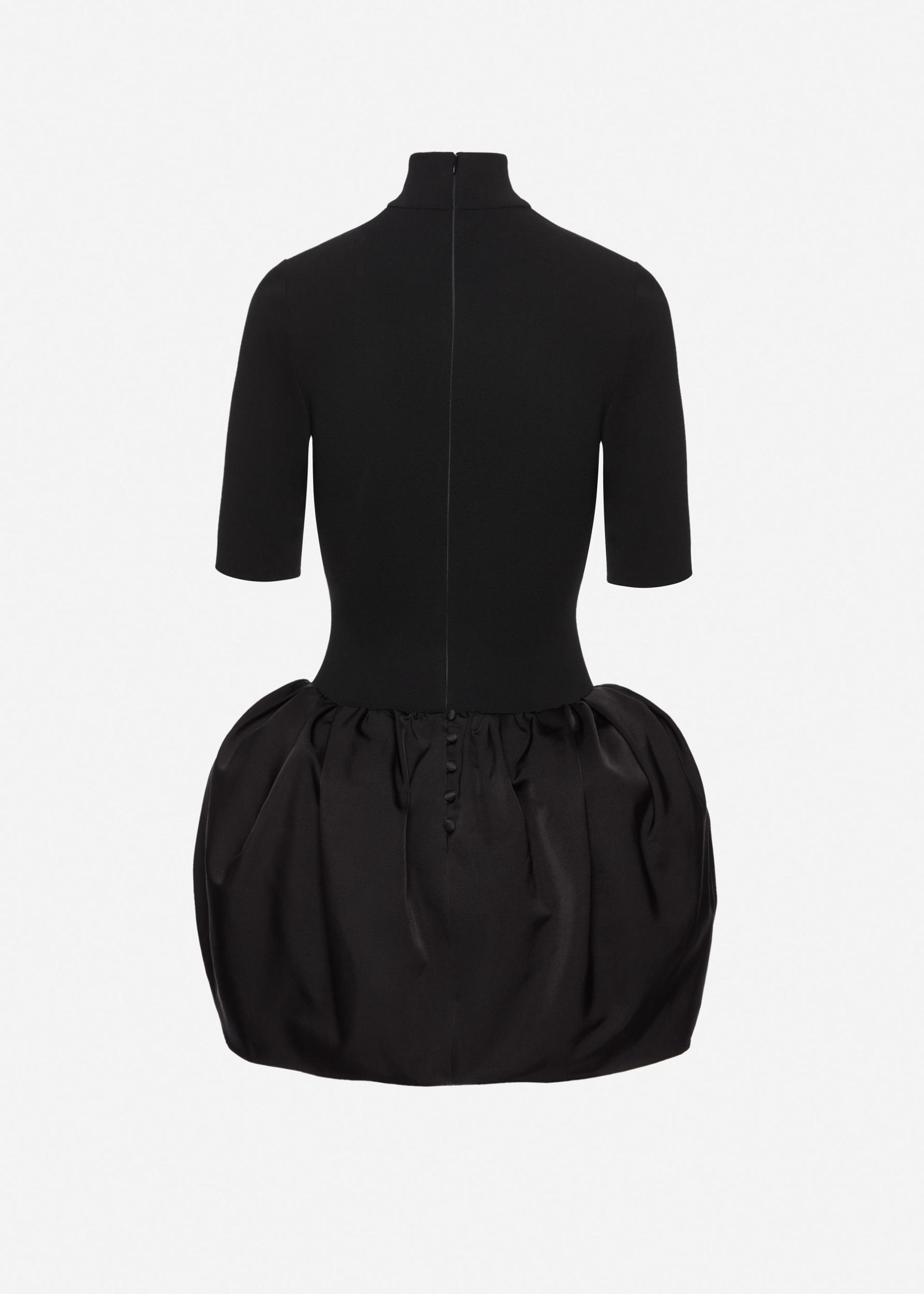 A dramatic mini dress featuring a sculpted bubble skirt and a sleek, form-fitting bodice. The upper body has a high turtleneck and elbow-length sleeves. The skirt is crafted from silk for a voluminous effect. Designed with an invisible back zip and functional buttons at the skirt, this piece is fully lined and finished with an internal bodysuit for structure and support.