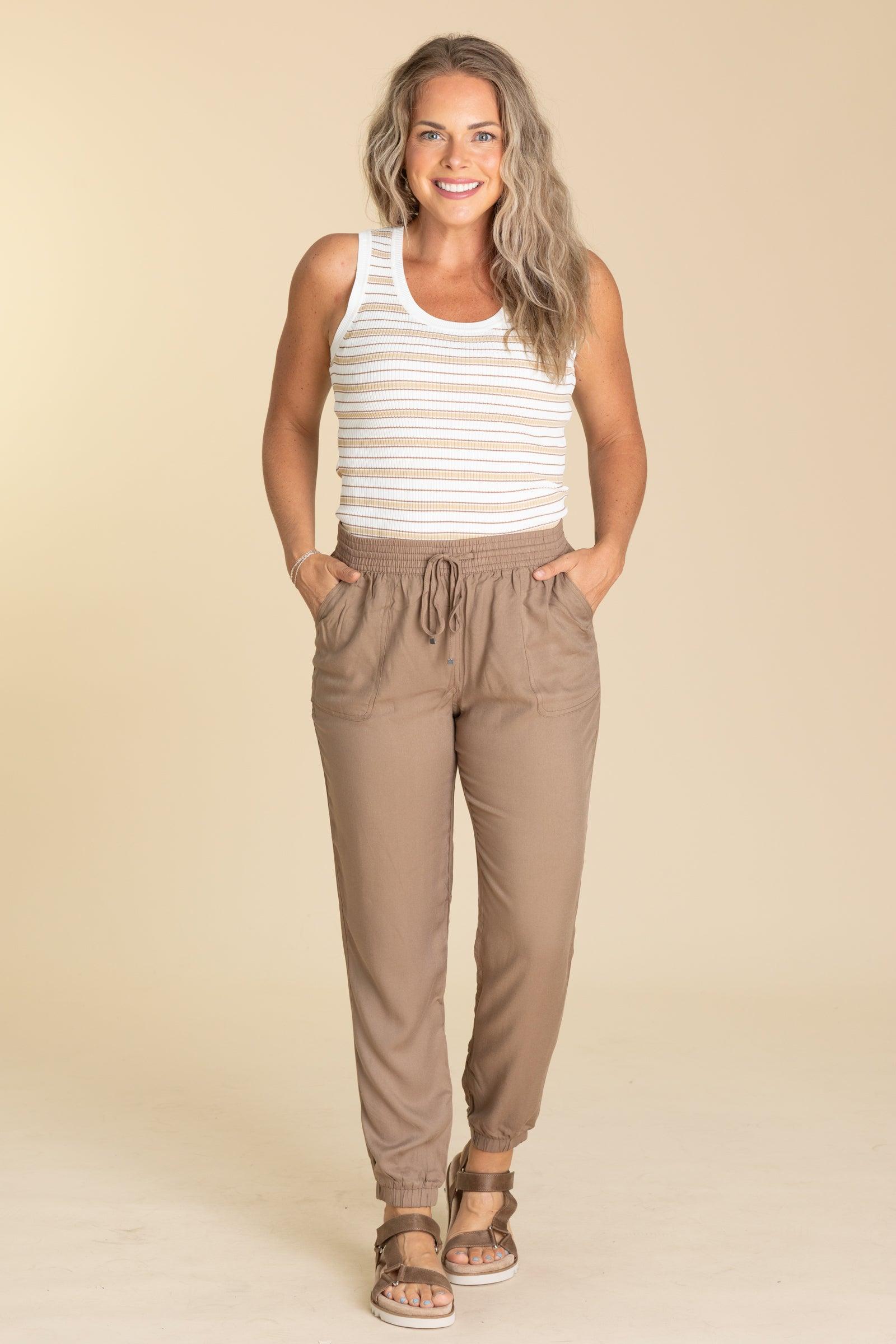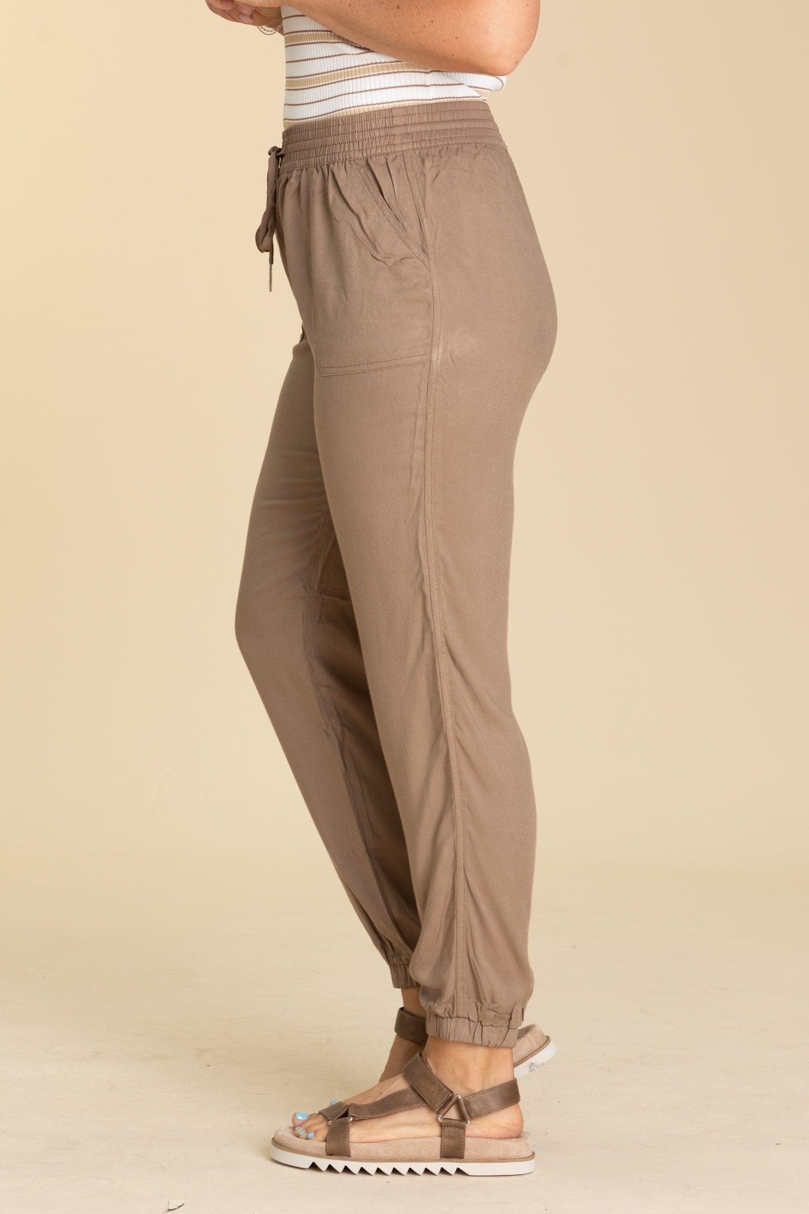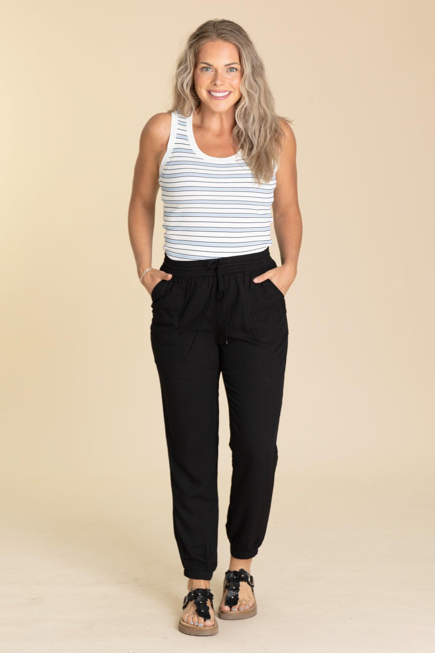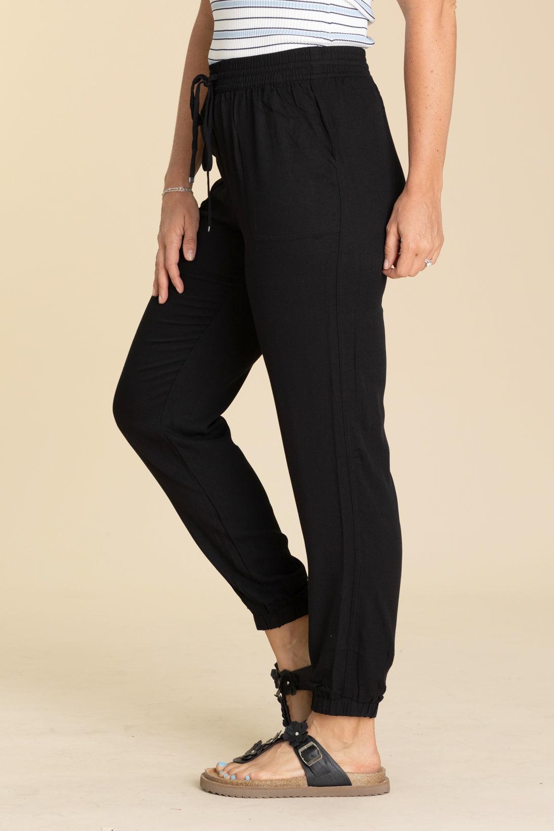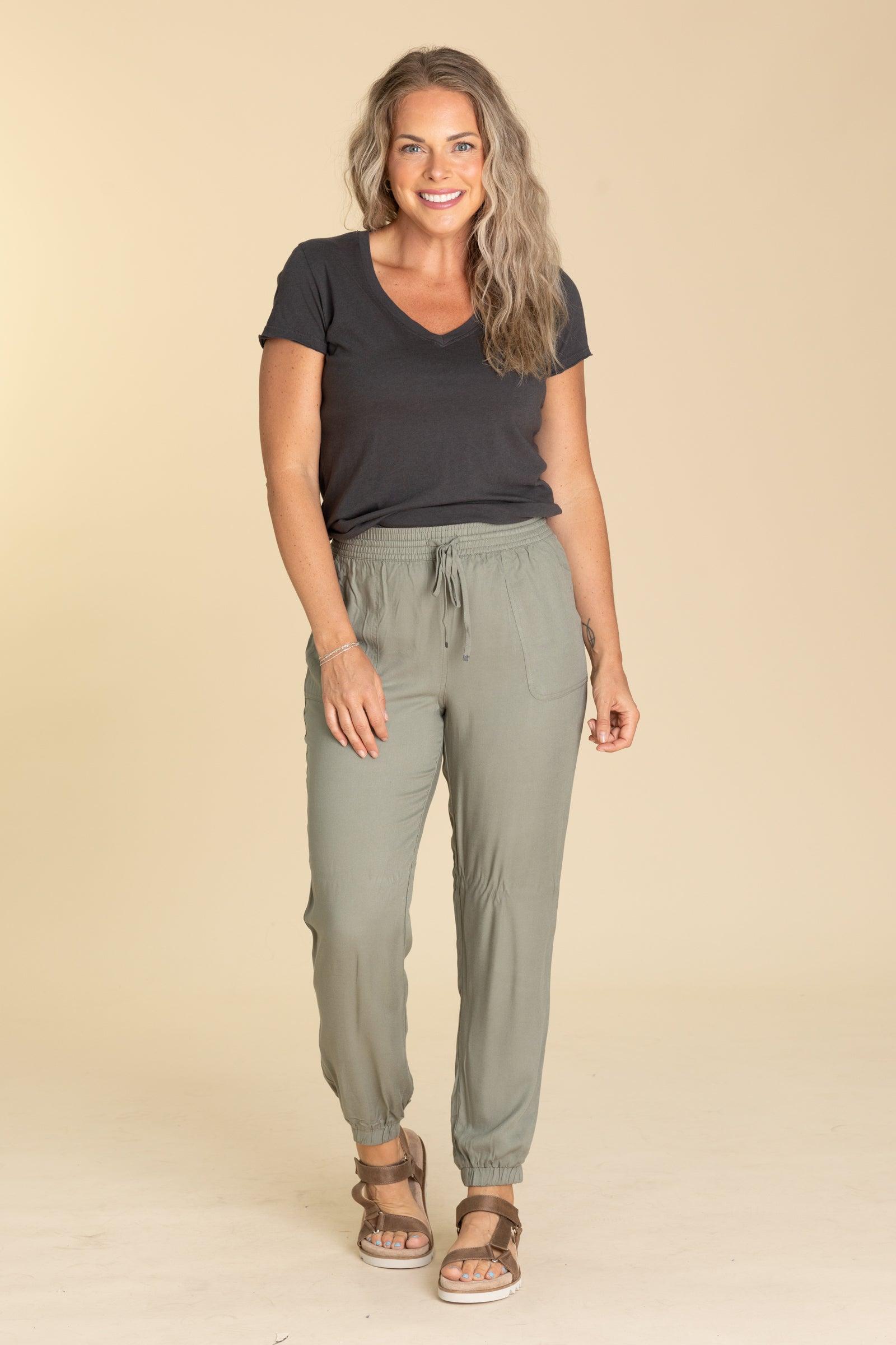 Product Details Color/Wash: Black/ Dark Taupe/ Sage Rise: High Rise Style: Joggers With Elastic Drawstring Waistband Brand: Be Cool Material and Care 100% Rayon Hand Wash Cold Hang/Line Dry Size and Fit Small: Waist 26" Rise 11.5" Inseam 28.5" Medium: Waist 28" Rise 12" Inseam 29" Large: Waist 30" Rise 12" Inseam 29.5" Erica is 5’7” and wearing her true size medium