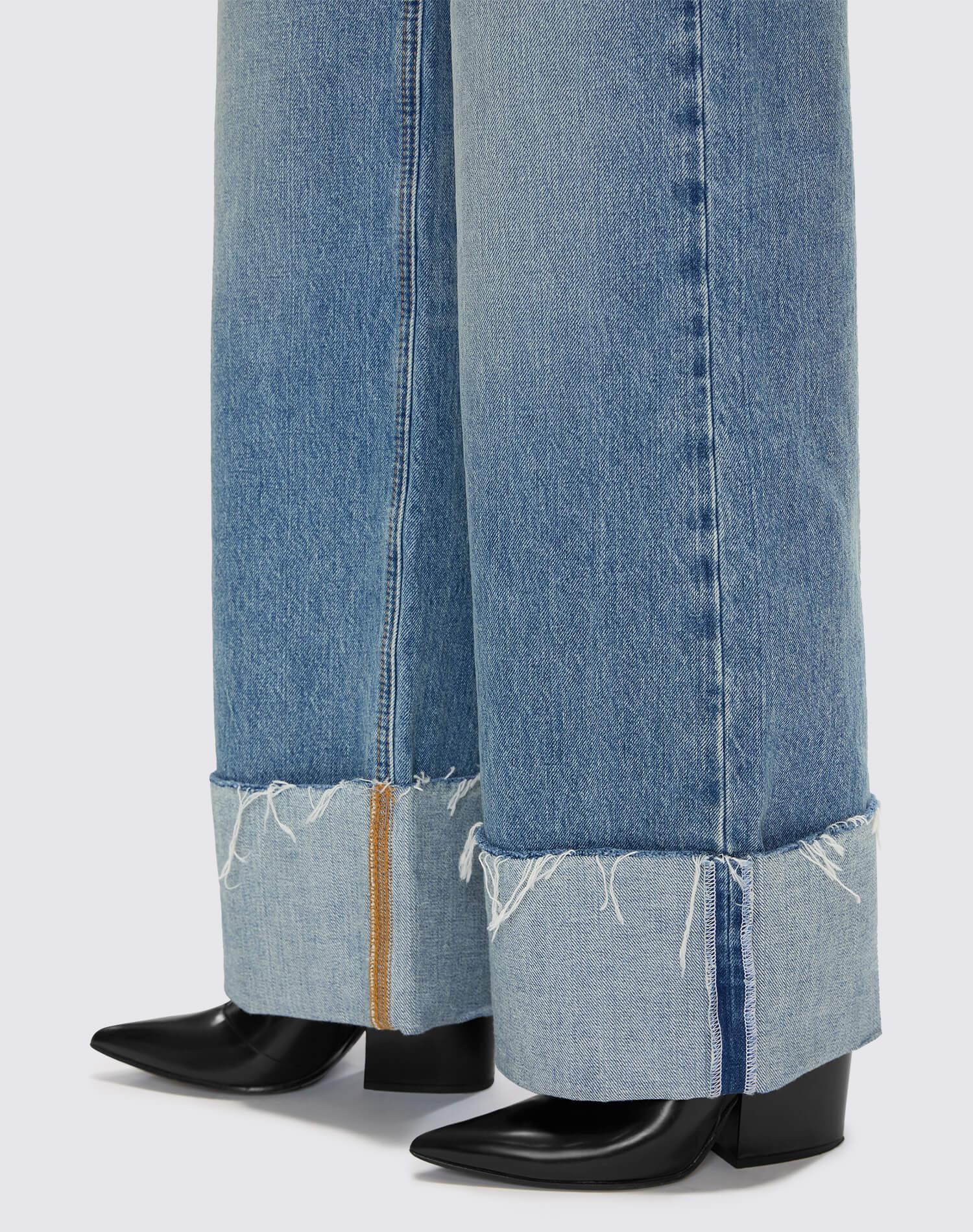 The High Rise Wide Leg in Vintage Biker Blue is our version of the classic 70s-inspired trouser flare with a high rise and full length inseam. Features a vintage 60s inspired wash on rigid fabric, classic button fly and mega cuff with a raw cut hem.