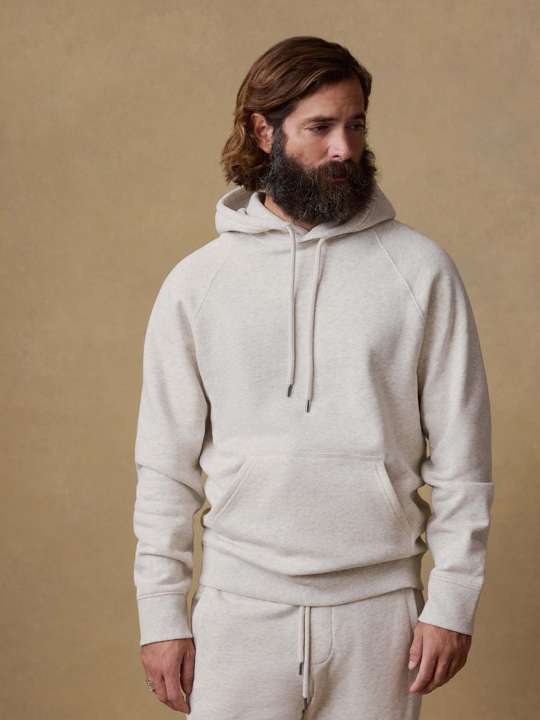 We set out to perfect the hoodie - super soft, just the right weight, and inspired by classic vintage athletic wear. Made from a blend of Pima organic cotton and organic cotton, this hoodie is all about comfort and durability. Perfect for lounging at home, weekend adventures, or layering up on cooler days, this hoodie combines timeless style with laid-back comfort. Fit: Relaxed fit Detail: Popover hoodie. Double layer hood with drawcord. Raglan sleeves. Kangaroo patch pocket with hidden zipper pocket. Knit rib at cuffs and hem. Sun & Waves embroidery at wearer's left cuff. Overlap seams inspired by vintage athletic wear. Material: 56% Organic Pima Cotton, 44% Organic Cotton; Ribbing at Sleeve Cuffs and Bottom Hem; Cotton Melange Round Drawcord at Hood with Metal Drawcord Tips; Hidden Pocket Zipper with Rubber Tipped Zipper Pull Model: Jamal is 6’2 wearing size Medium Care: Close all zippers before wash. Turn inside out. Machine wash cold with like colors. Delicate cycle. Do not bleach. Tumble dry low. Remove promptly. Warm iron when needed. MQF2413-AQV