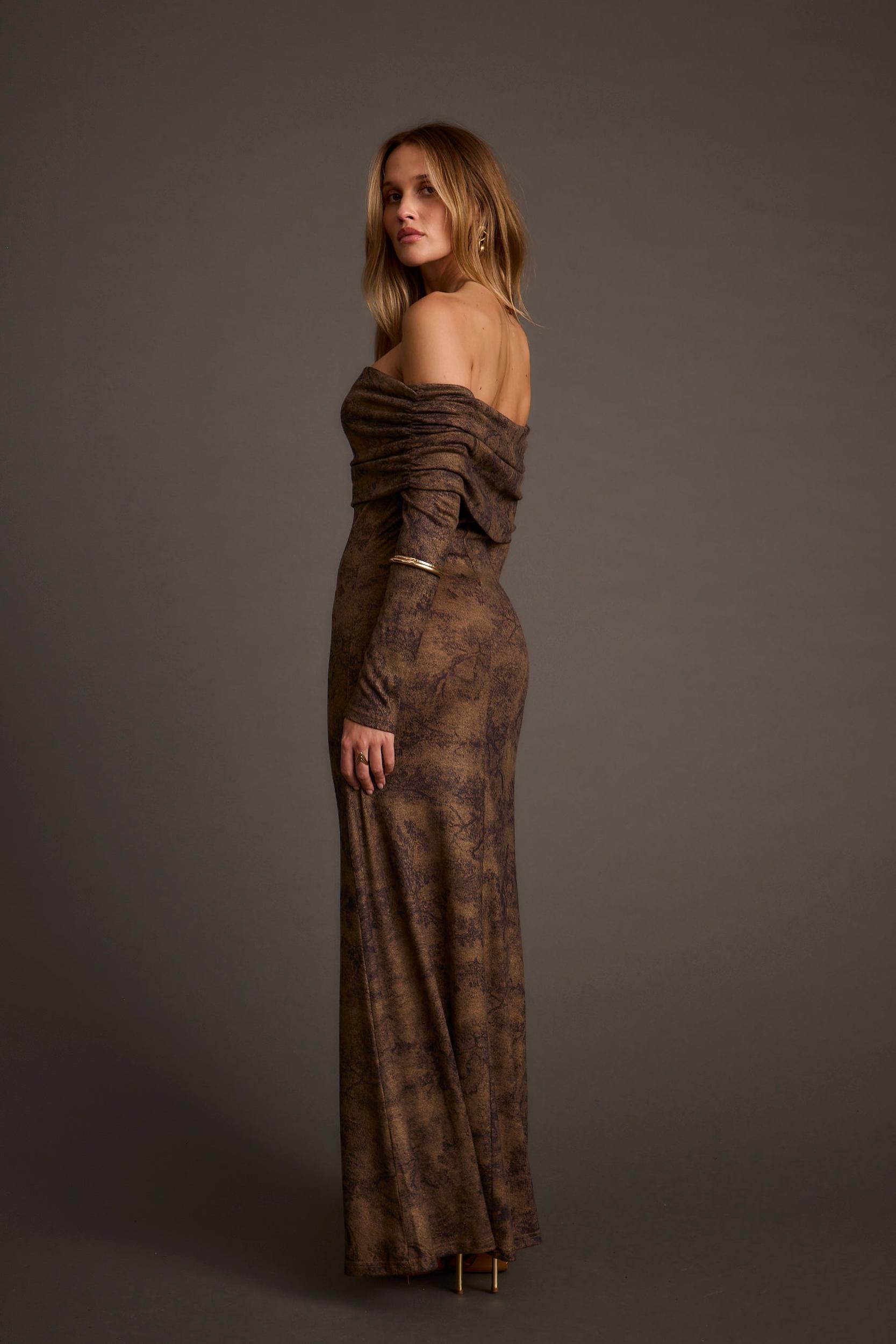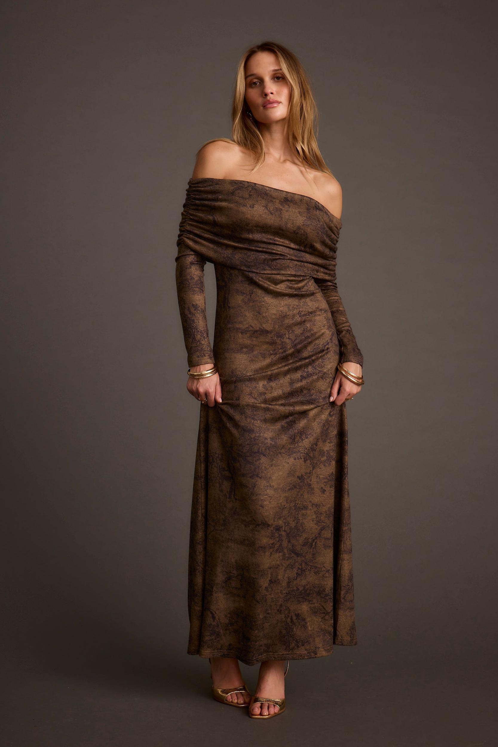 The Hollis Mocha Blur Off the Shoulder Maxi Dress is inspired by our best-selling Simone Sweater Maxi Dress. The thick knit material creates gorgeous movement, and the fold-over off-the-shoulder neckline gives this dress an effortless, feminine look.