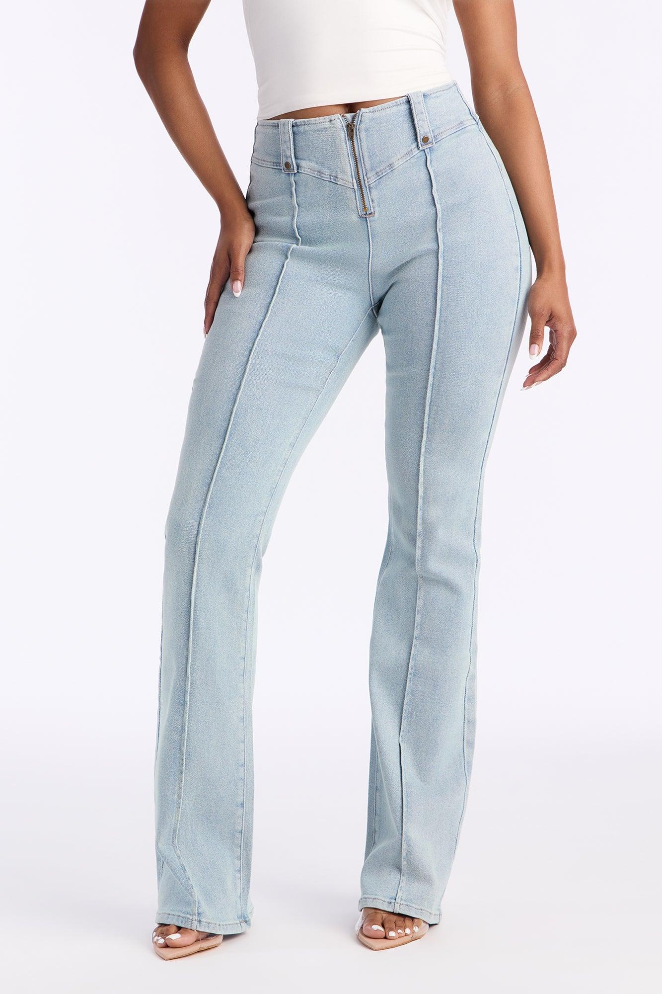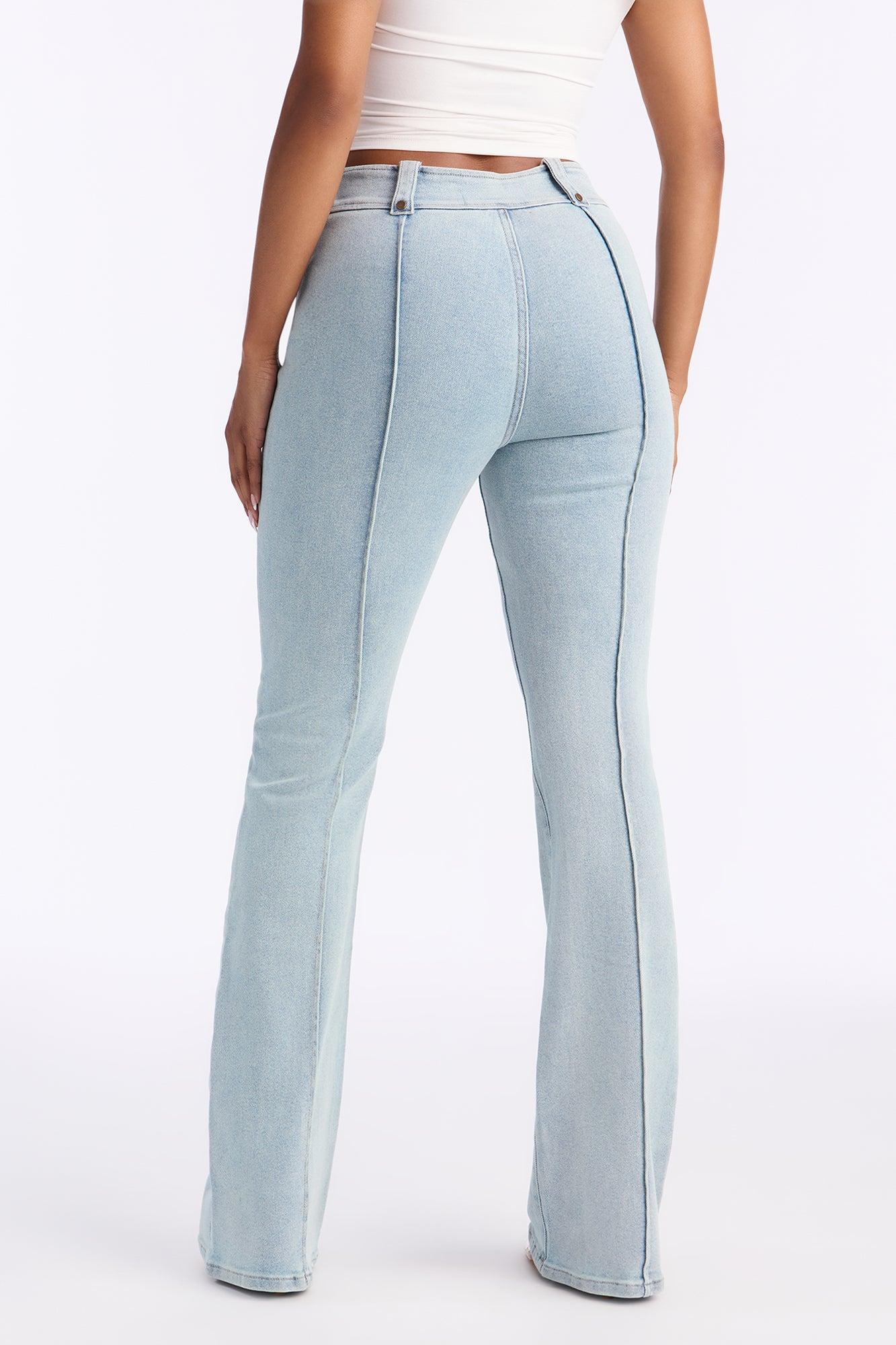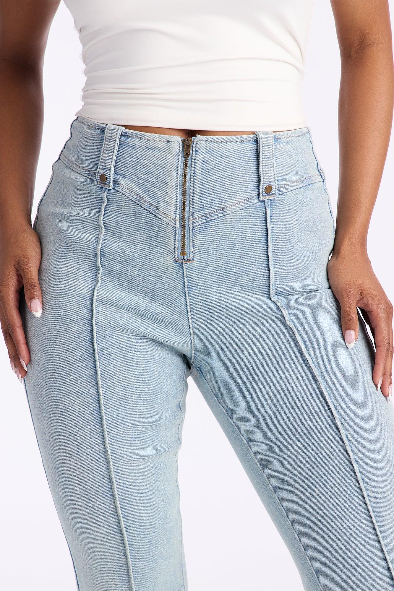 Available In Light Wash. Flare Jean Front Zip Closure Seaming Detail 10" Rise 34" Inseam Medium Stretch Disclaimer: Due To The Specialized Wash Process, Each Garment Is Unique. Self : 70% Cotton 28% Polyester 2% Spandex Imported California Proposition 65WARNING: Cancer and Reproductive Harm - www.P65Warnings.ca.gov.