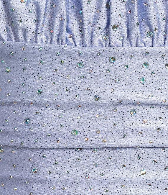 From Honey and Rosie, this dress features: Glitter fabric Square neck Sleeveless Adjustable spaghetti straps Shirred bust Side and back ruching Side slit Zip-back closure Nylon/spandex; partially lined Hand wash; dry flat Imported.