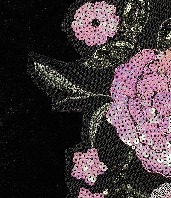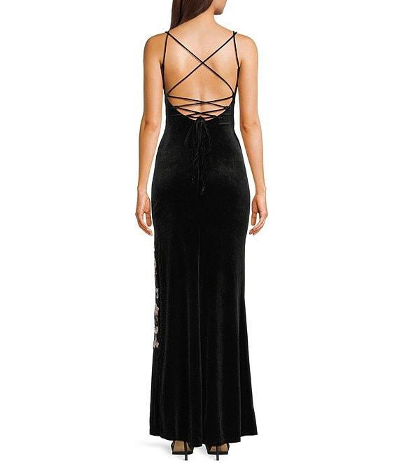 From Honey and Rosie, this ballgown features: Scoop neckline Sleeveless Adjustable double spaghetti straps Sequin placement embroidery Lace up back closure Zip-back closure 57" length Polyester/spandex with partial lining Hand wash/line dry Imported.