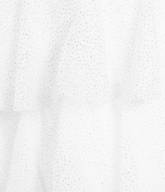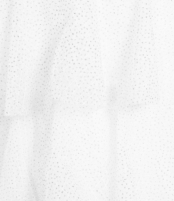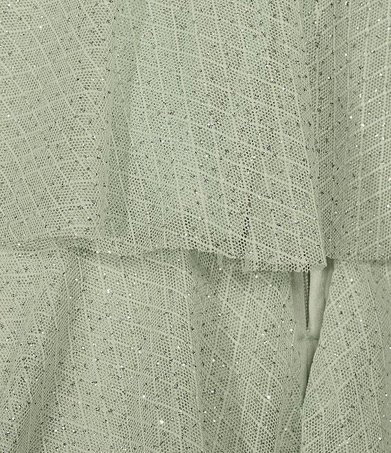 From Honey and Rosie this dress features: Metallic nylon mesh Sweetheart neckline Sleeveless Adjustable spaghetti straps Bow at top of the shoulder Shirred bodice with a small keyhole Three ruffle skirt Zipper at center back Lined Approx. 26" Polyester/spandex Hand wash/line dry Imported.