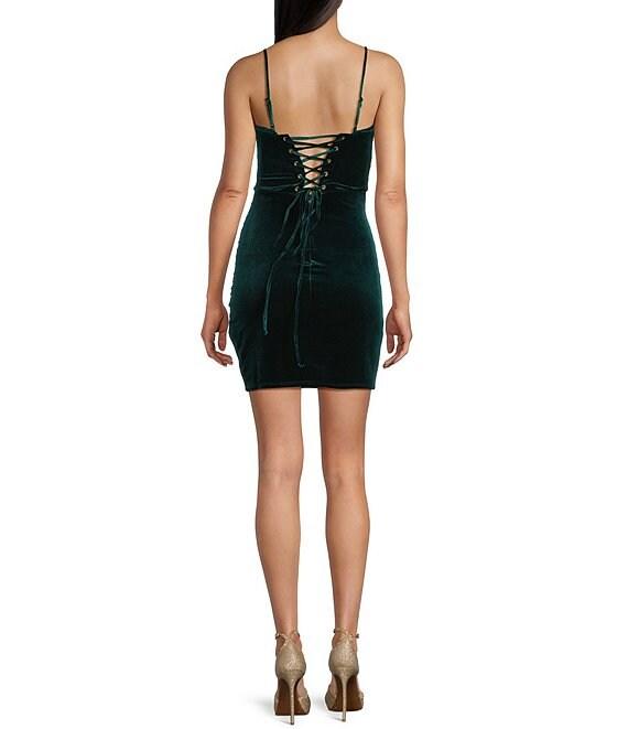 From Honey and Rosie, this dress features: Velvet fabric Sweetheart neckline with lace trim Sleeveless Adjustable shoulder straps Bustier bodice with boning Zip and lace-up back closure Side slit 26.5" length Polyester/spandex; fully lined Machine wash/lay flat to dry Imported.