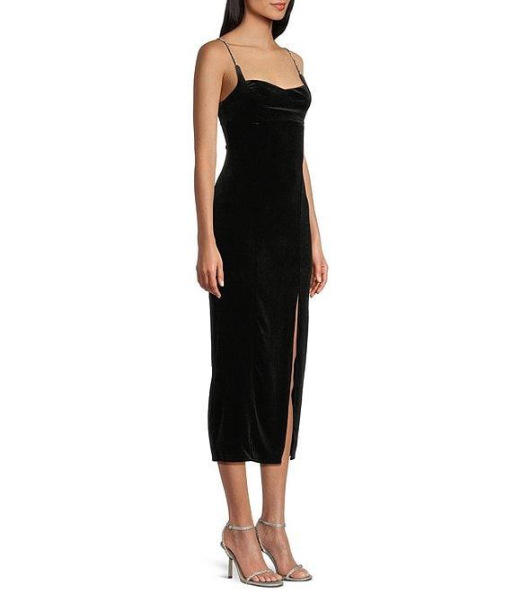 Honey and Rosie Velvet Sweetheart Neck Rhinestone Strap Side Slit Midi Dress
