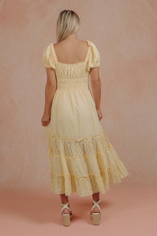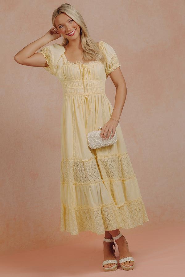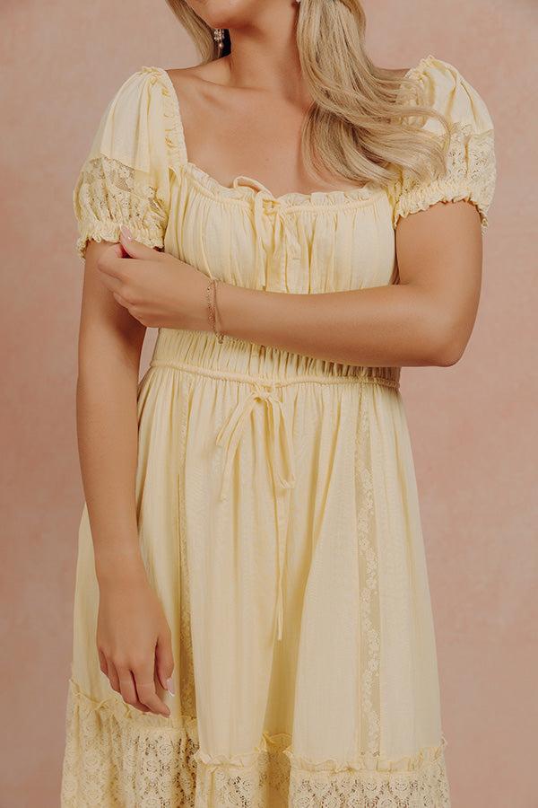 Soft, romantic, and full of delicate detail, this midi dress brings an effortlessly feminine feel with its lightweight design and subtle texture. The lace accents and tiered skirt add dimension, creating a look that feels airy and beautifully styled. The silhouette is fitted through the waist with a stretchy smocked detail and adjustable drawstring, then flows into a breezy skirt with alternating lace tiers. A ruffled scoop neckline with a tie and keyhole detail adds a soft finishing touch, while puff sleeves with lace accents complete the look. Details: • Lightweight material • Built-in skirt lining ending above the knee • Ruffled scoop neckline • Tie detail with keyhole accent • Short puff sleeves • Elastic shoulders and cuffs • Lace detailing at sleeves • Smocked waist detail • Functional drawstring at waist • Hidden side pockets • Tiered skirt with alternating lace panels • Midi length hem Fit Notes: • Fitted at the waist • Flowy through the skirt Measurements