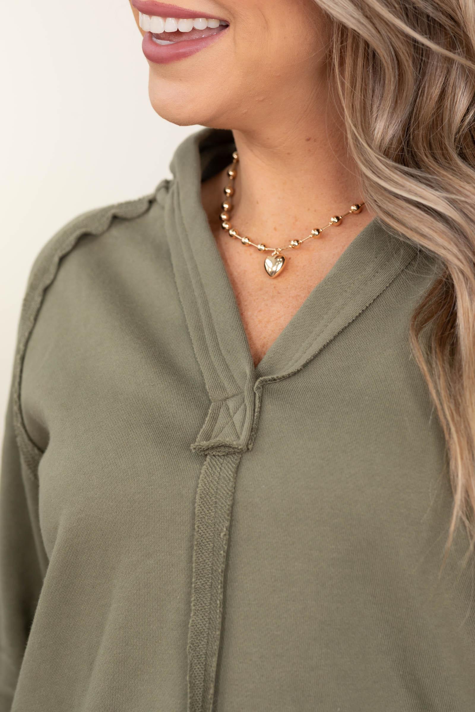 Product Details Colors: Olive/ Light Beige Print: Solid Neckline: V-Neck with Hood Sleeve: Long Sleeve Hemline: Straight Brand: Blu Pepper Material and Care Self: 60% Cotton, 40% Polyester Contrast: 58% Cotton, 39% Polyester, 3% Spandex Hand Wash Cold Hang/Line Dry Size and Fit Small: Bust 44" Waist 42" Length 24" Medium: Bust 46" Waist 44" Length 24.5" Large: Bust 48" Waist 46" Length 25" Erica is 5’7” and wearing her true size small
