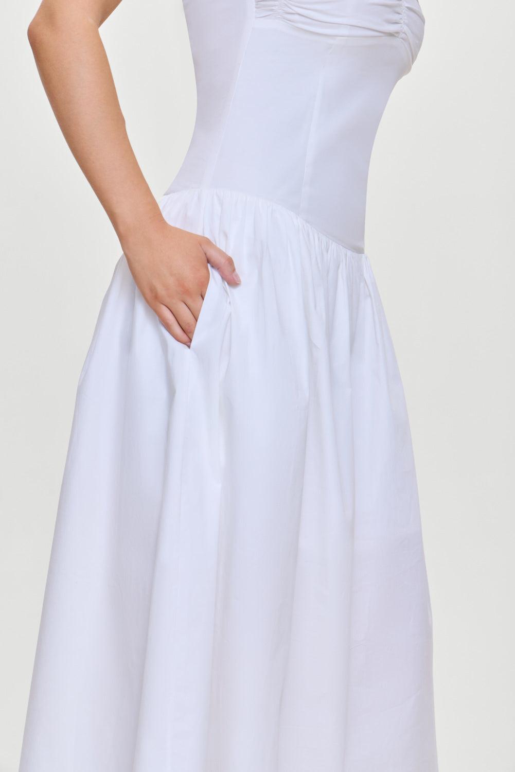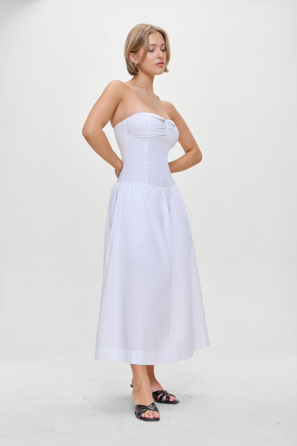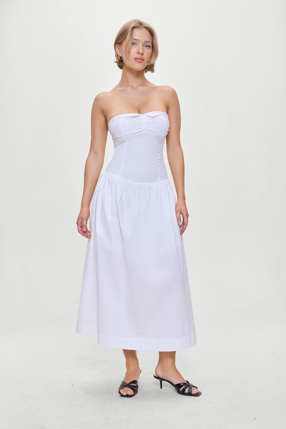 The Horizon midi dress is an elegant silhouette designed in our soft poplin fabric. This strapless midi dress features a collared neckline and delicate shirred detailing at the bust. Perfect for warm-weather weekends or an effortlessly polished everyday look. Details Drop waist Stretchy smocked back for fit flexibility Fabric 98% Cotton + 2% Spandex Model Size & Fit This style runs true to size Laura is wearing a size Small Height 5' 7" (170.18cm) Bust 34.4" (86.5), Waist 23.5” (59.68cm), Hips 35” (88.9cm)