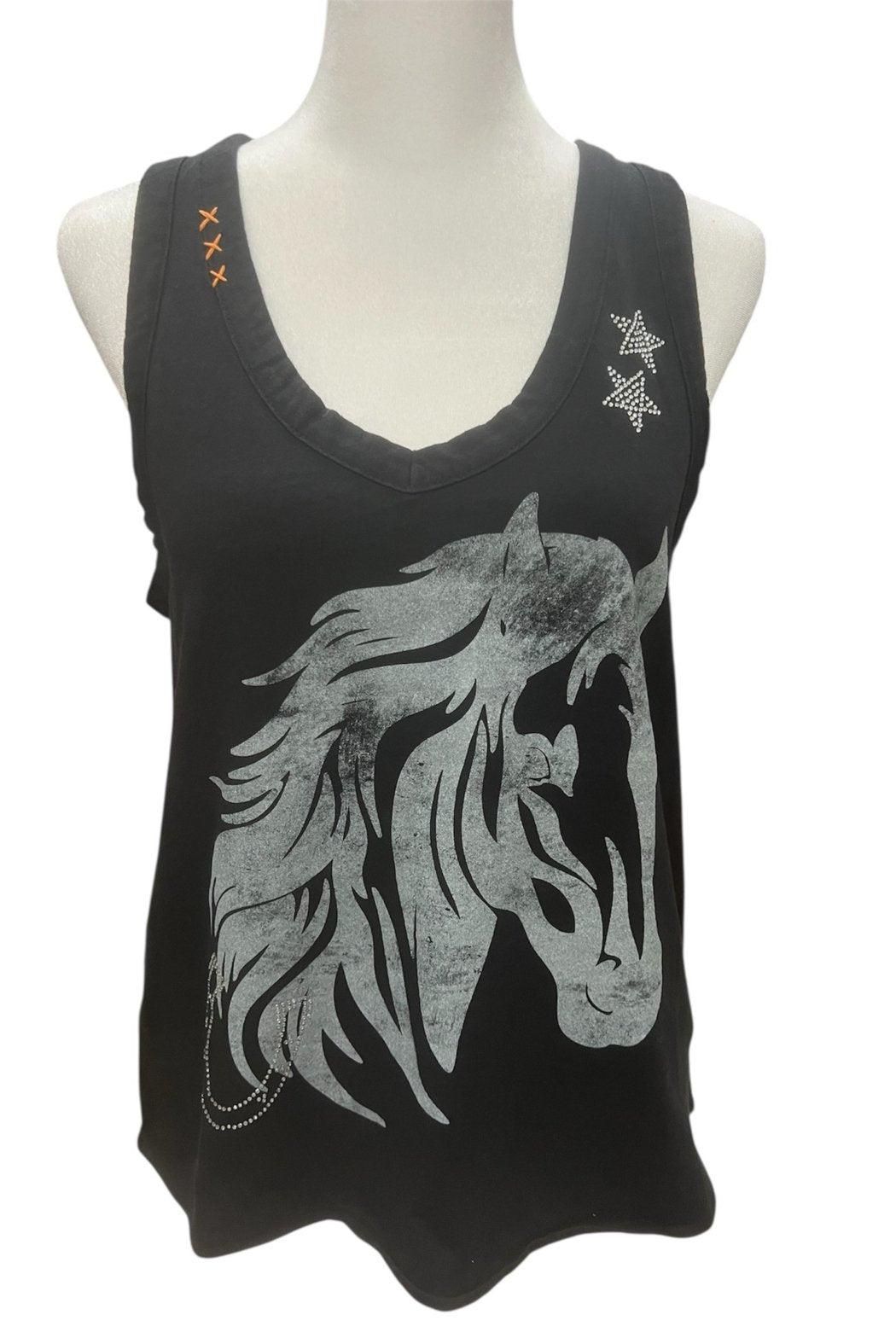 Show off your Western flair with this standout Horse Graphic Tank! Featuring a bold horse print across the front, this sleeveless top brings a rustic charm to any casual outfit. A sparkling rhinestone star detail adds a touch of glam, giving it just the right amount of shine. Crafted from soft, breathable fabric, it’s perfect for summer days, rodeos, or layering under your favorite denim jacket. Whether you're in the saddle or on the street, this tank combines strength and sparkle with effortless style.