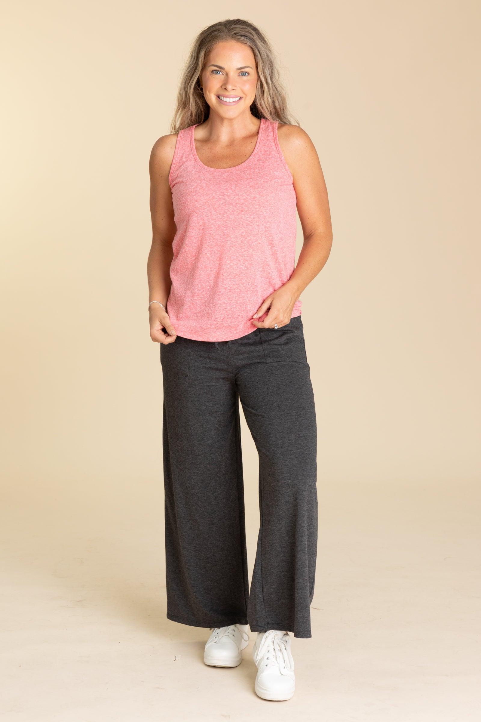 Product Details Colors: Hot Coral Print: Heathered Neckline: Round Sleeve: Sleeveless Hemline: Straight Brand: Staccato Material and Care 50% Polyester 38% Cotton 12% Rayon Hand Wash Cold Hang/Line Dry Size and Fit Small: Bust 34" Waist 35" Length 25.5" Medium: Bust 36" Waist 37" Length 26" Large: Bust 38" Waist 39" Length 26.5" X Large: Bust 40" Waist 41" Length 27" Erica is 5’7” and wearing her true size small