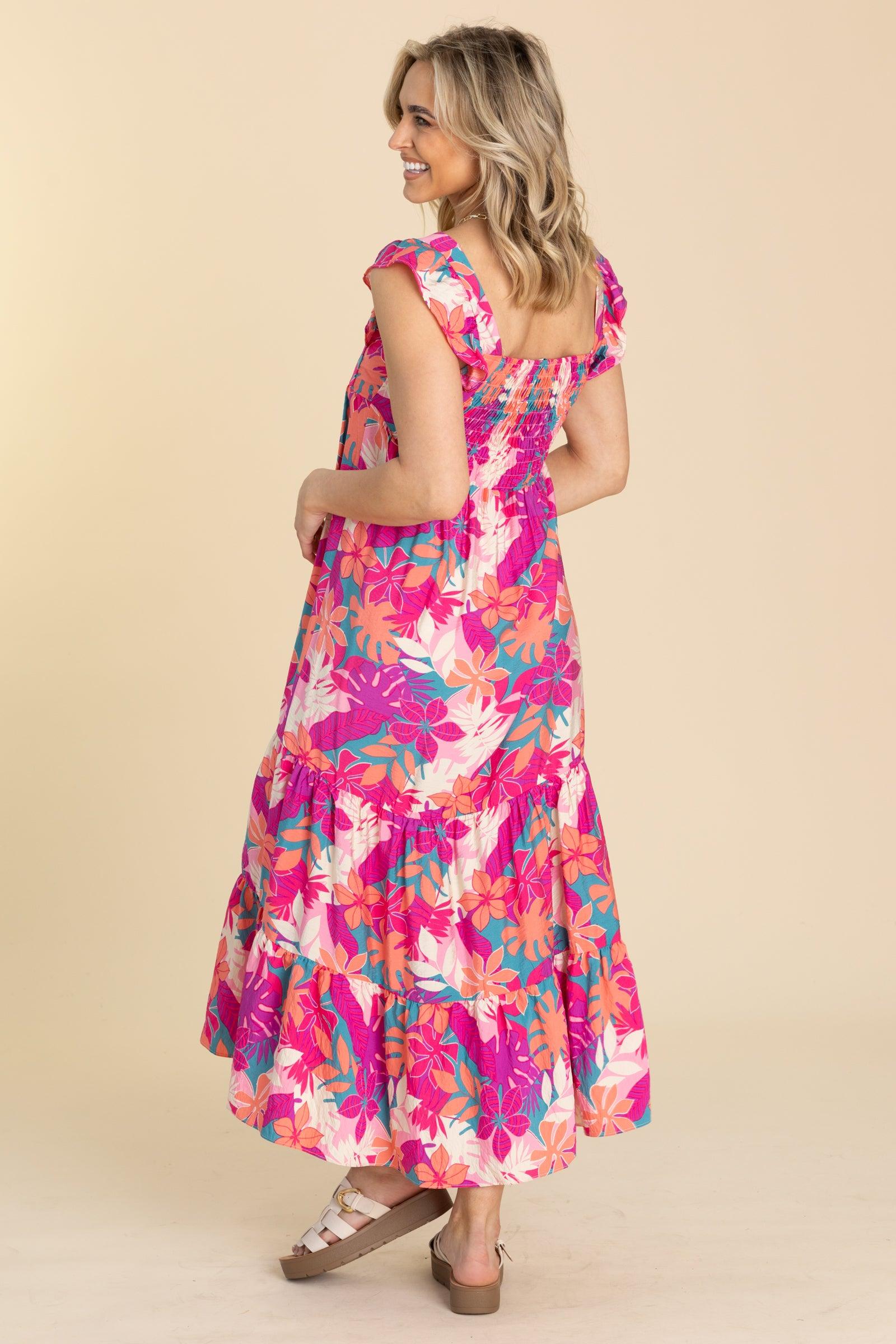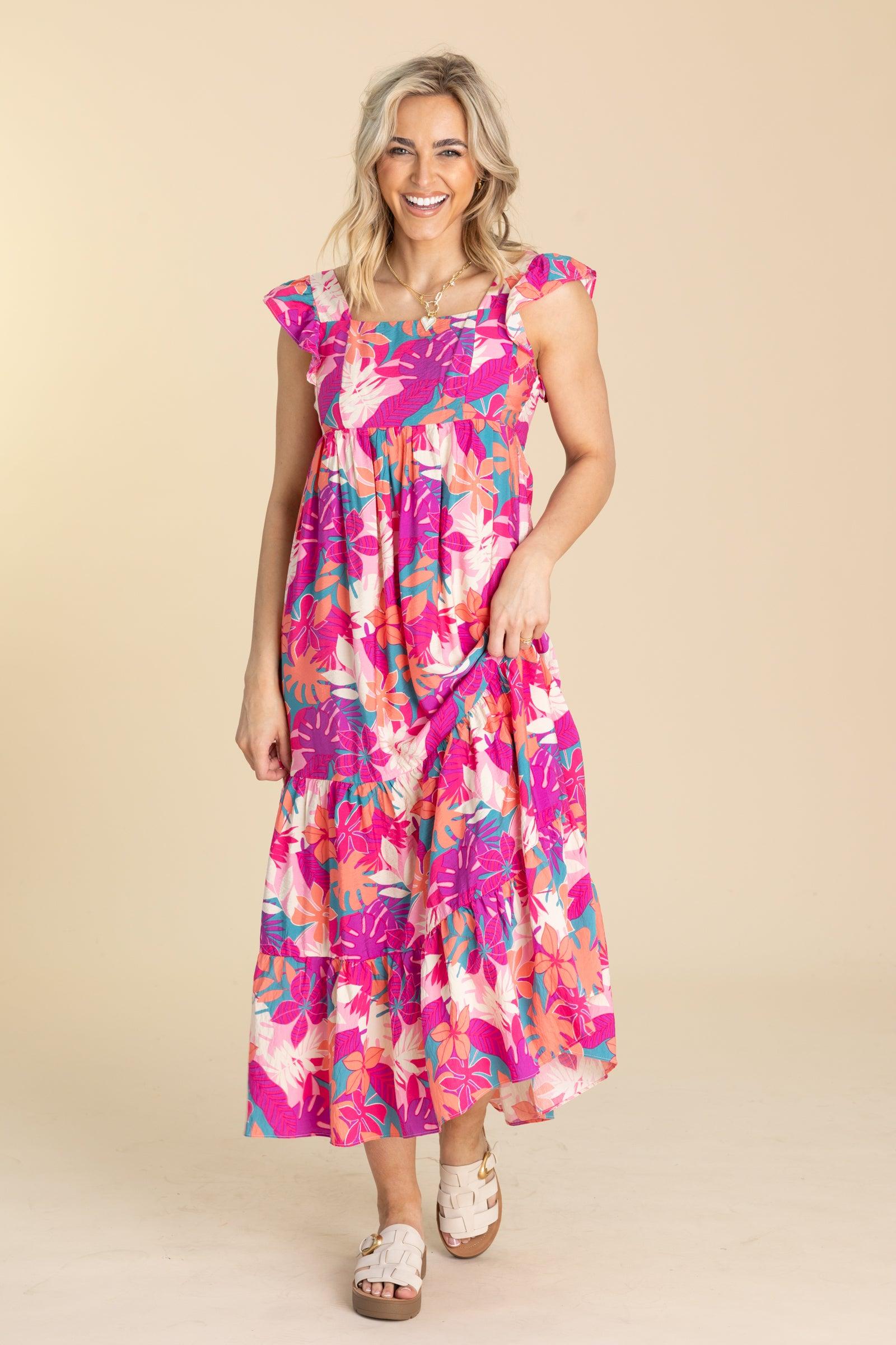 Product Details Colors: Hot Pink, Purple, Coral, Teal, Ivory, Pink Print: Floral Neckline: Square Sleeve: Sleeveless Hemline: Straight Brand: Staccato Material and Care Self: 85% Rayon 15% Nylon Hand Wash Cold Hang/Line Dry Size and Fit Small: Bust 32" Waist 28" Length 52" Medium: Bust 34" Waist 30" Length 52.5" Large: Bust 36" Waist 32" Length 53" X Large: Bust 38" Waist 34" Length 53.5" Sarah is 5’8” and wearing her true size small Video Model is 5'8"and wearing size small