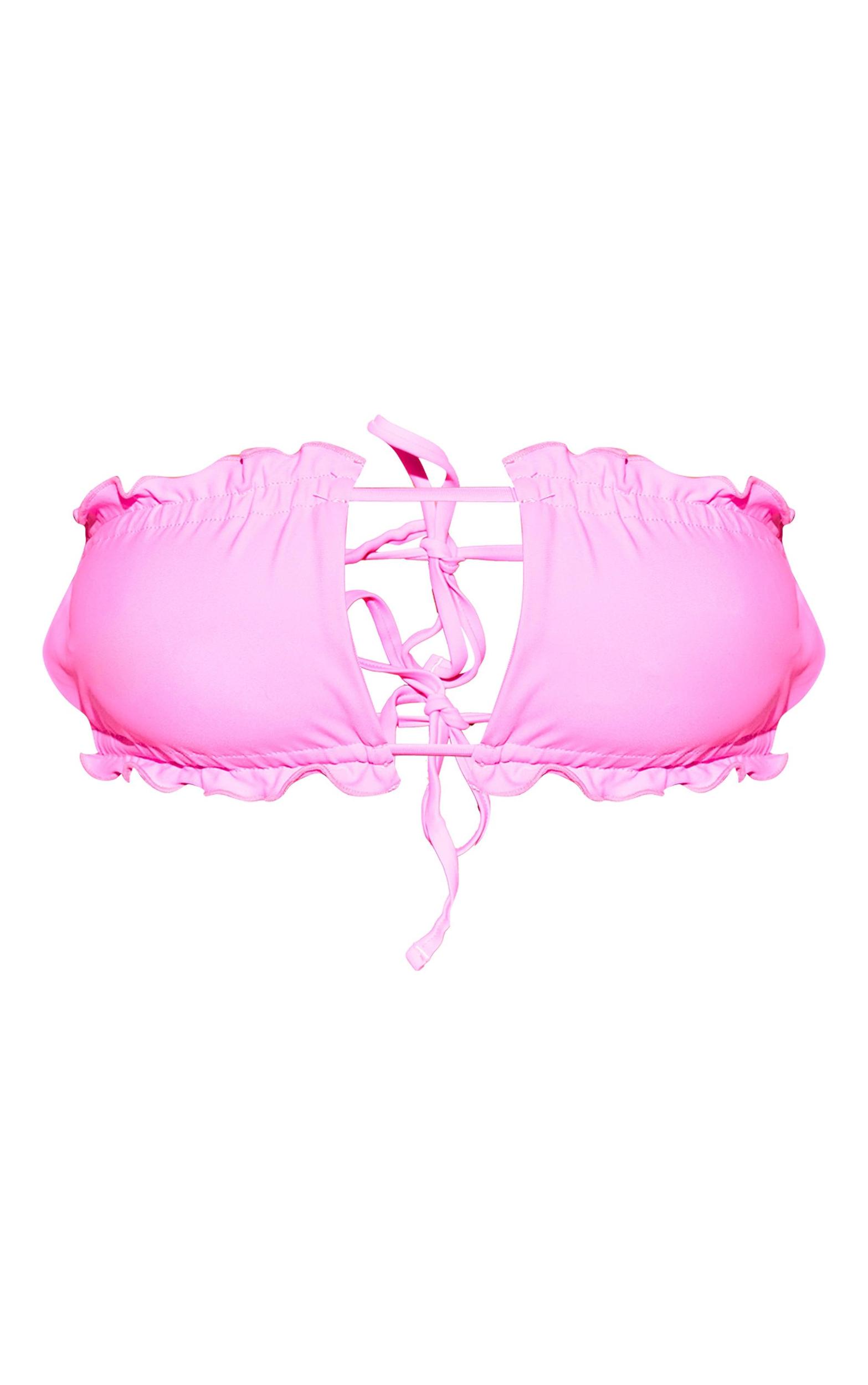 Add a pop of pink into your vacay wardrobe with this hot pink frill edge detail bandeau bikini top. This bikini top is brought to you in a hot pink material with a frill edge and detailing, what's not to love? Style this bikini top with the matching bikini bottoms, high heels and accessories. Length approx 16.5cm/6.5inch (Based on a sample size UK 8) Model wears size UK 8/ EU 36/ AUS 8/ US 4Model Height - 5ft 5inchp]:!mb-0inch>Category: SwimwearProduct type: Bandeau Bikini TopColor: Hot PinkMaterial: SwimDesign: PrintSleeves: SleevelessOccasion: Day