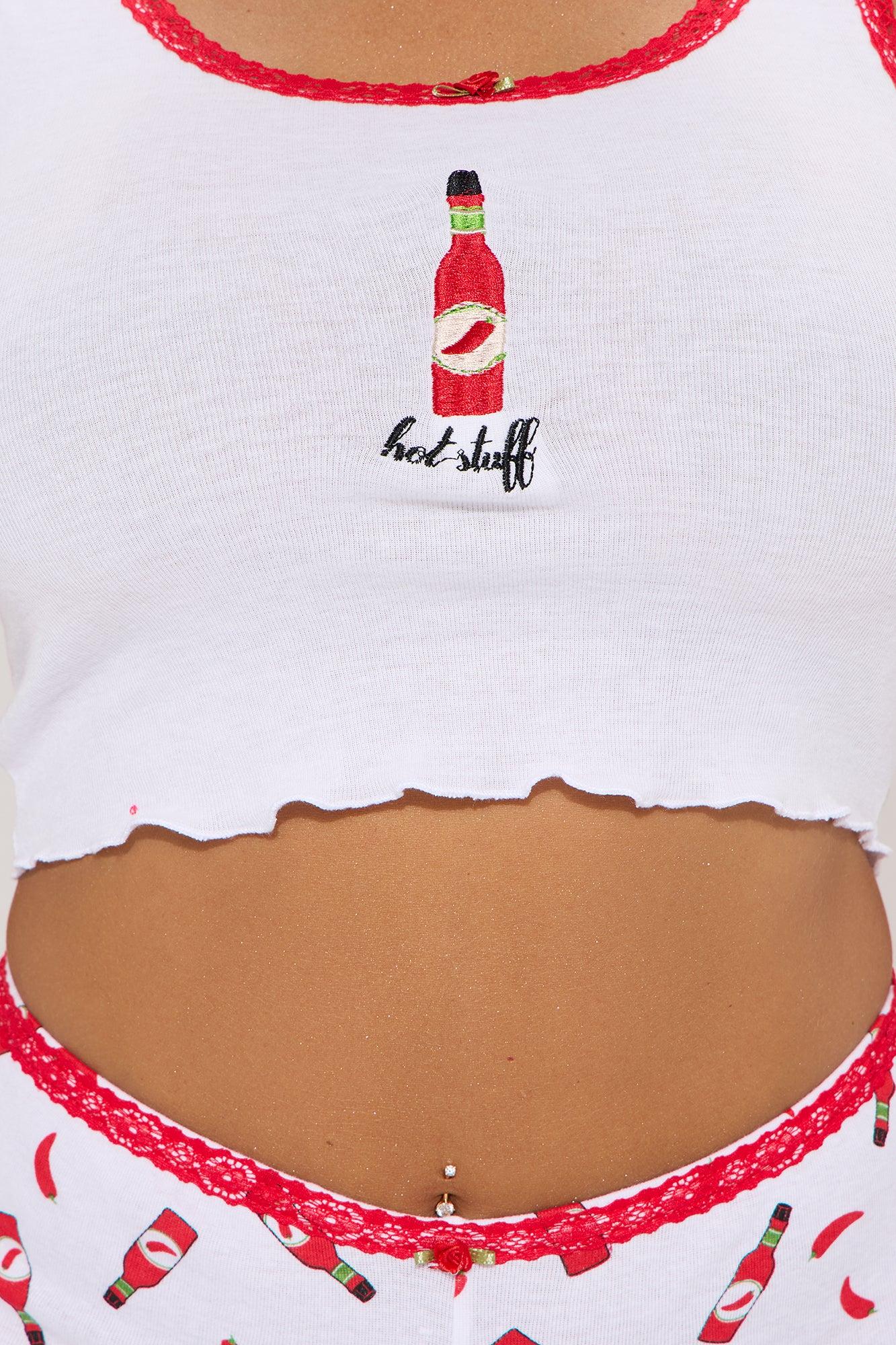Available In White/combo. PJ Short Set Tank Top Lace Trim Rosette Detail Hot Sauce Print Matching Shorts Stretch Final Sale Disclaimer: Print Placement May Vary Top & Bottom: 60% Cotton 40% Polyester Imported