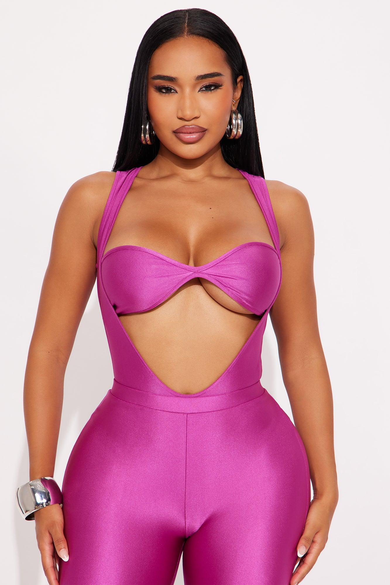 Available In Black And Magenta. 3 Piece Ensemble Bodysuit, Bralette And Pant Set Stretch Snap Button Closure Elastic Waistband Flare Leg 34.5" Inseam Self: 80% Polyester 20% Spandex Imported California Proposition 65WARNING: Cancer and Reproductive Harm - www.P65Warnings.ca.gov.