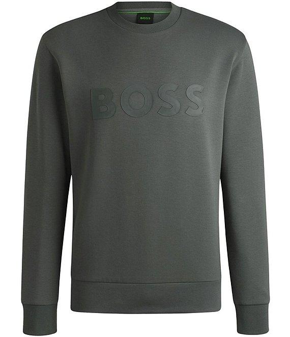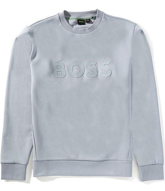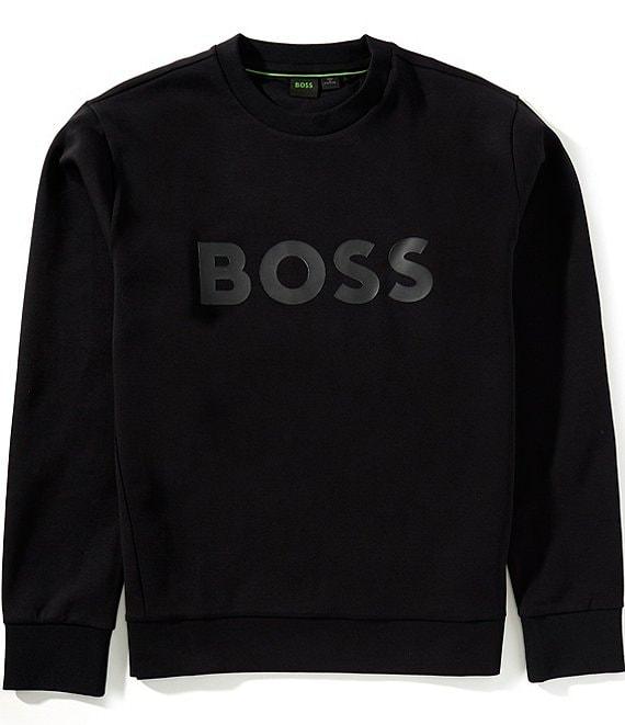 From BOSS, this sweatshirt features: Crew neckline Long sleeves Large "BOSS" logo on front Ribbed trim Pullover construction Regular fit Stretch fabric Cotton/elastane Machine wash/tumble dry Imported.